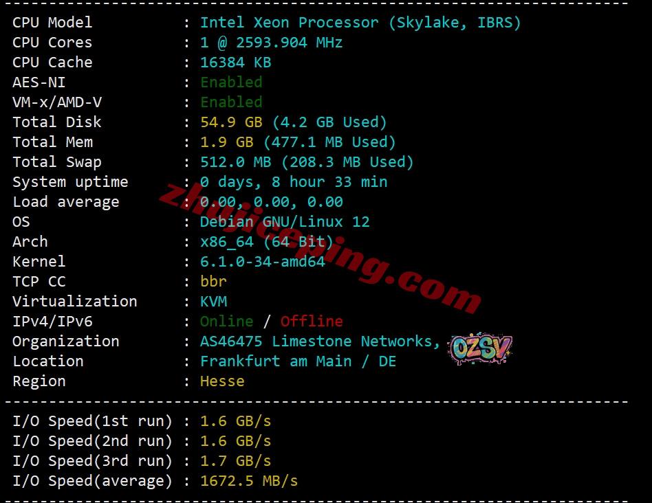 官方明确说明了使用的CPU型号为Intel Xeon Gold 6142,通常双路32核、64线程、主频2.6GHz、加速频率3.7GHz,站长启用了BBR,而且为了测评方便默认关闭了IPv6.从下图中可以看出服务器的上游托管方为Limestone,归属地德国法兰克福,当前I/O大致在1672MB/S: