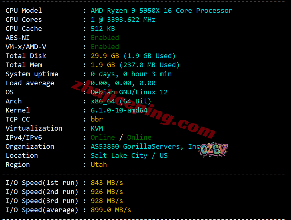 服务器用的CPU型号具体为AMD Ryzen 9 5950X(主频3.4GHz、加速频率4.9GHz),站长启用了BBR,支持IPv6,上游网络由gorillaservers提供,归属地美国犹他州,当前I/O大致899MB/S: