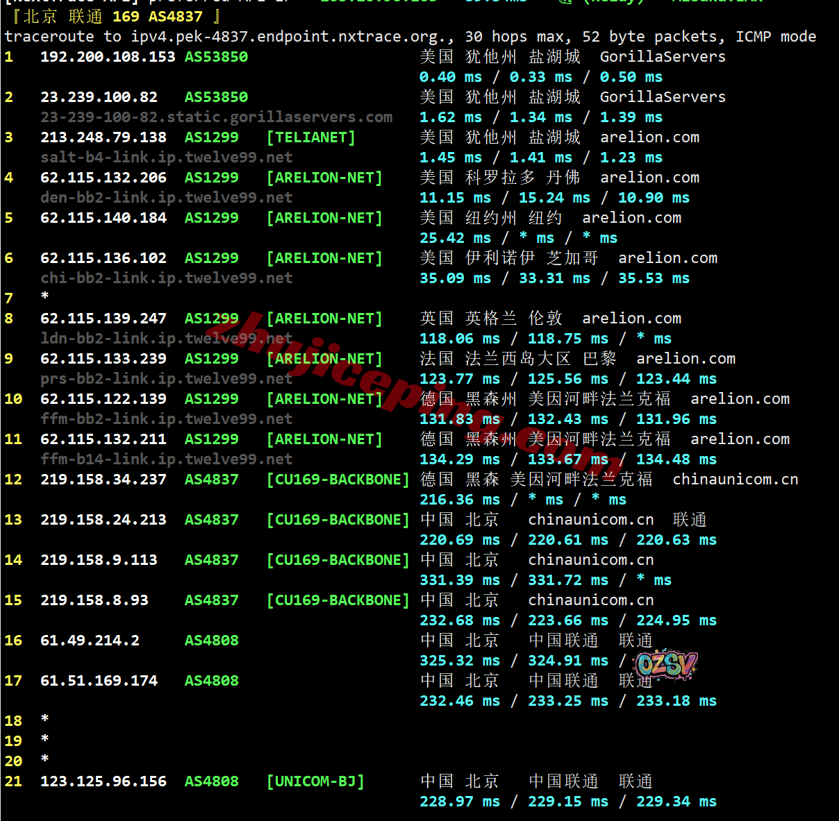 北京方向:机房网络接telia经过盐湖城、丹佛、芝加哥去英国、法国、德国,从联通德国法兰克福节点直连回国