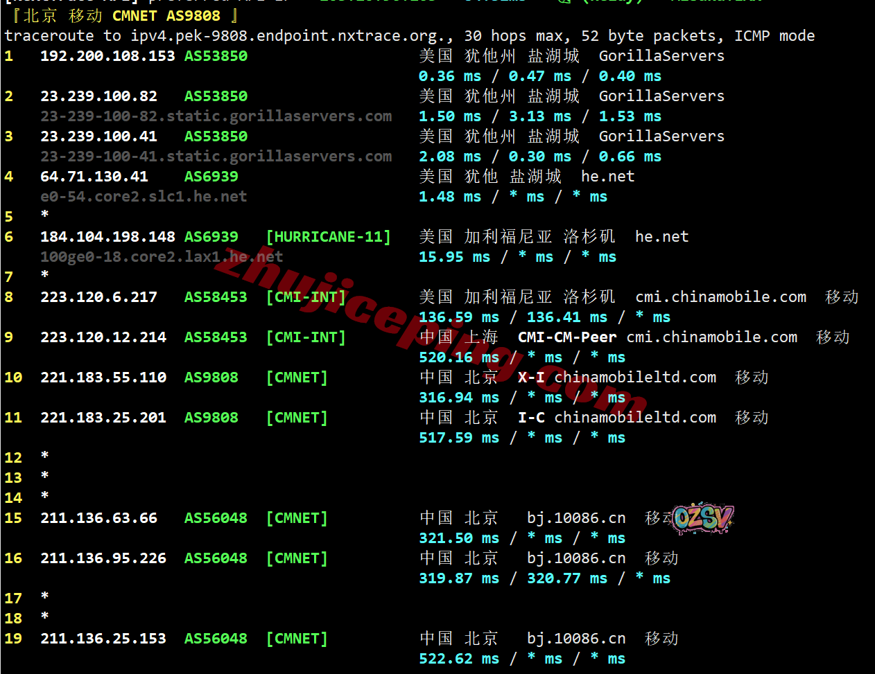 北京方向:走机房网络经经过盐湖城转HE.NET经过洛杉矶,从移动洛杉矶节点直连回国