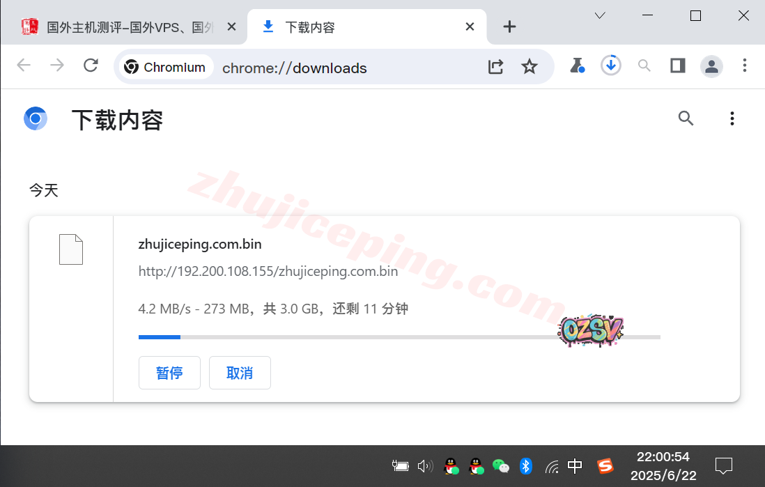 存放在测试VPS上的文件,站长广州联通家宽,直接用Chrome下载该文件测速,大致速度如下: