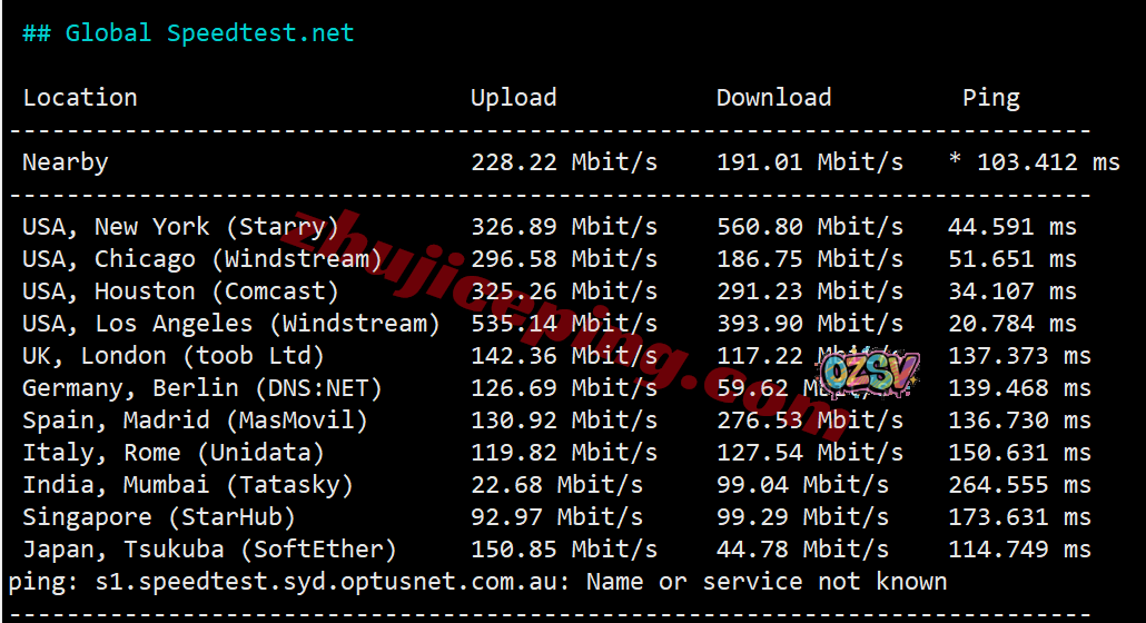 SpeedTest.Net的部分国际节点的带宽上下行测试数据: