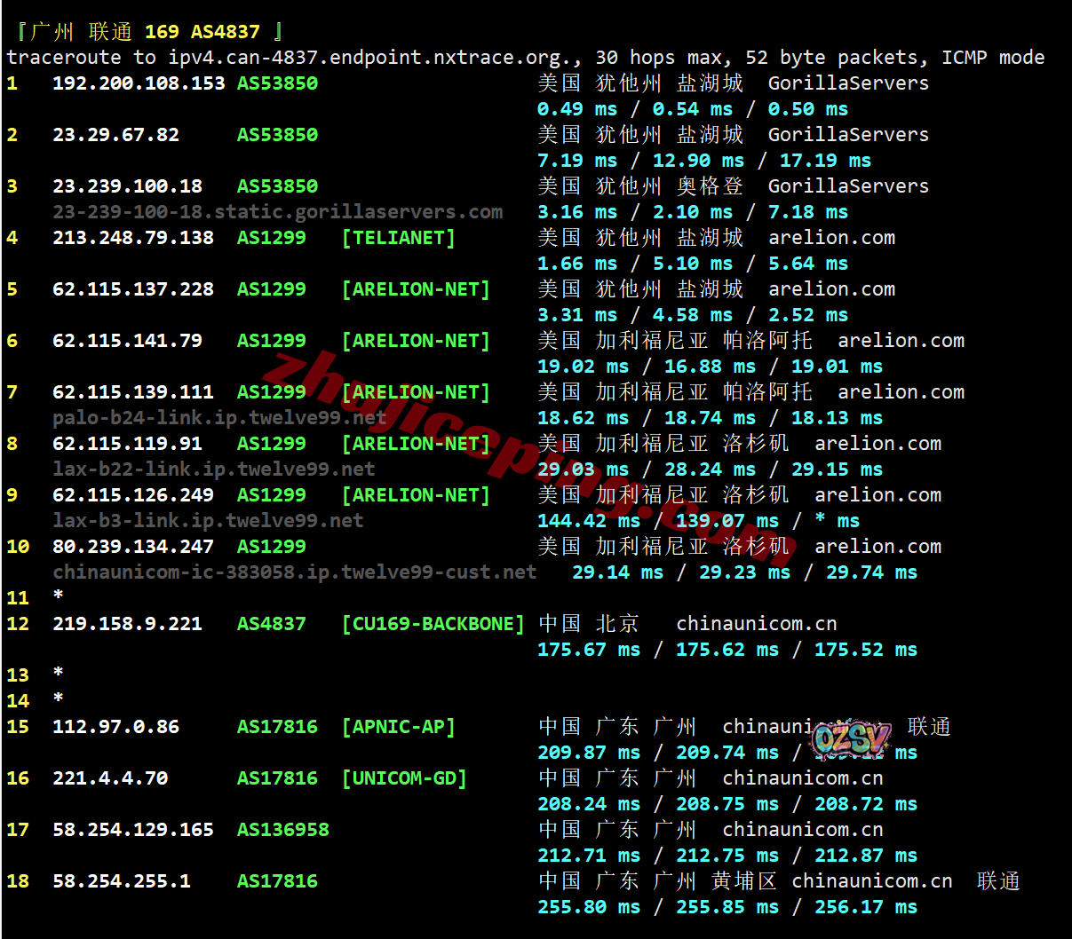 广州方向:走机房网络接telia经过盐湖城、帕洛阿托、洛杉矶回国