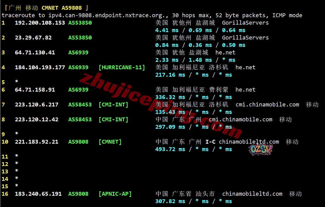 广州方向:走机房网站经过盐湖城转HE.NET去洛杉矶、费利蒙、洛杉矶移动CMI直连回国