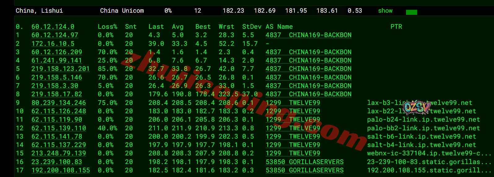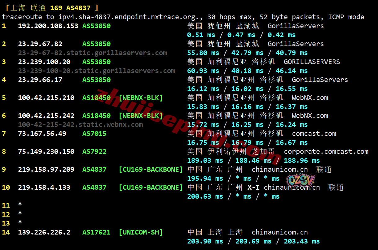 上海方向:走机房的网络去洛杉矶转webnx接Comcast出海回国