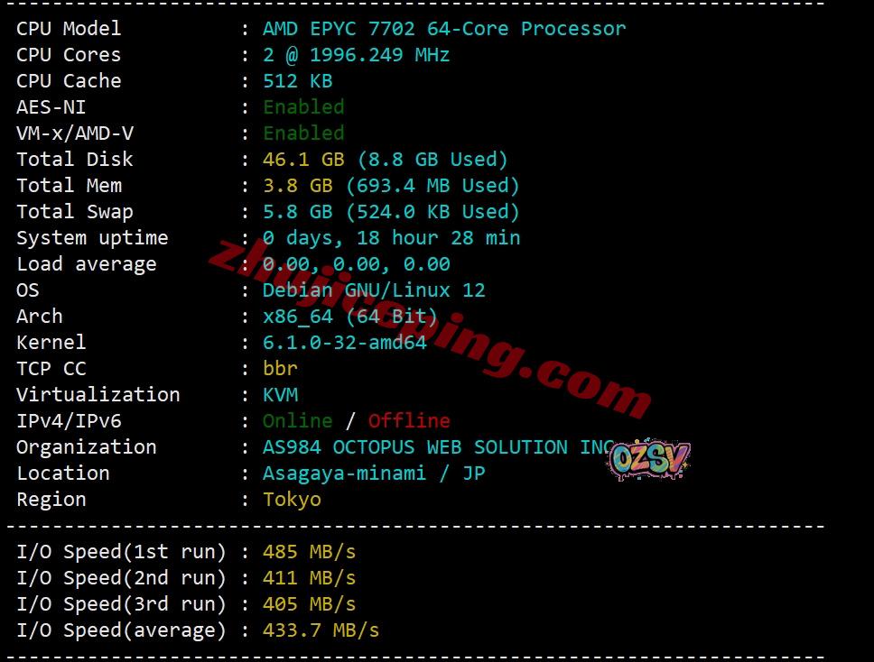 服务器用的CPU型号为AMD EPYC 7702(7002系列,64核、128线程、主频2.0GHz、加速3.35GHz),启用了BBR,不支持IPv6,上游为AS984,归属地日本东京,当前I/O大致433MB/S: