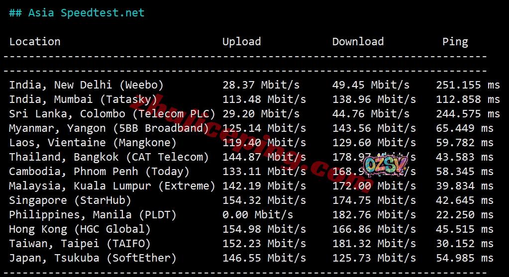 speedtest.Net的部分亚洲节点的上下行测试数据: