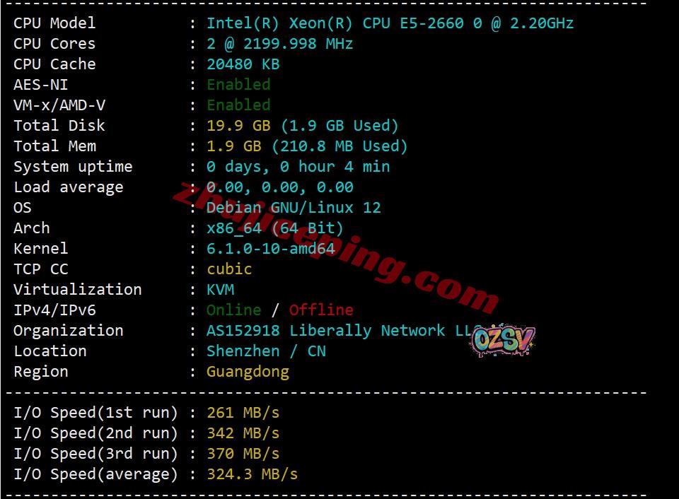 服务器用的CPU为e5-2660(8核、16线程、2.2GHz主频),IP归属地深圳,当前I/O大致324MB/S