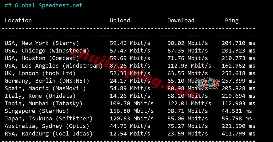 再看看speedtest.Net的部分国际节点的测试数据: