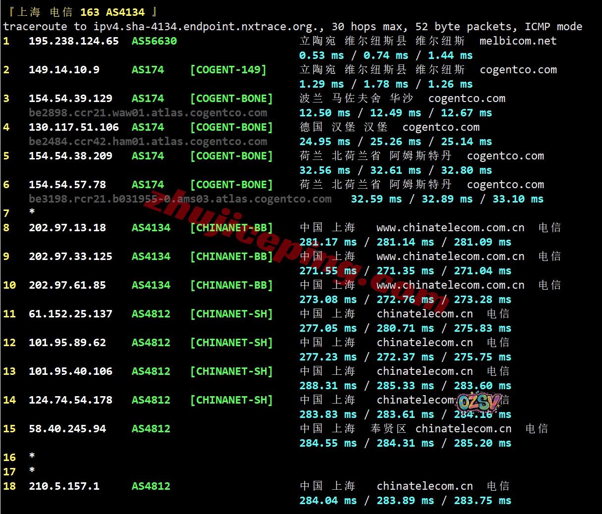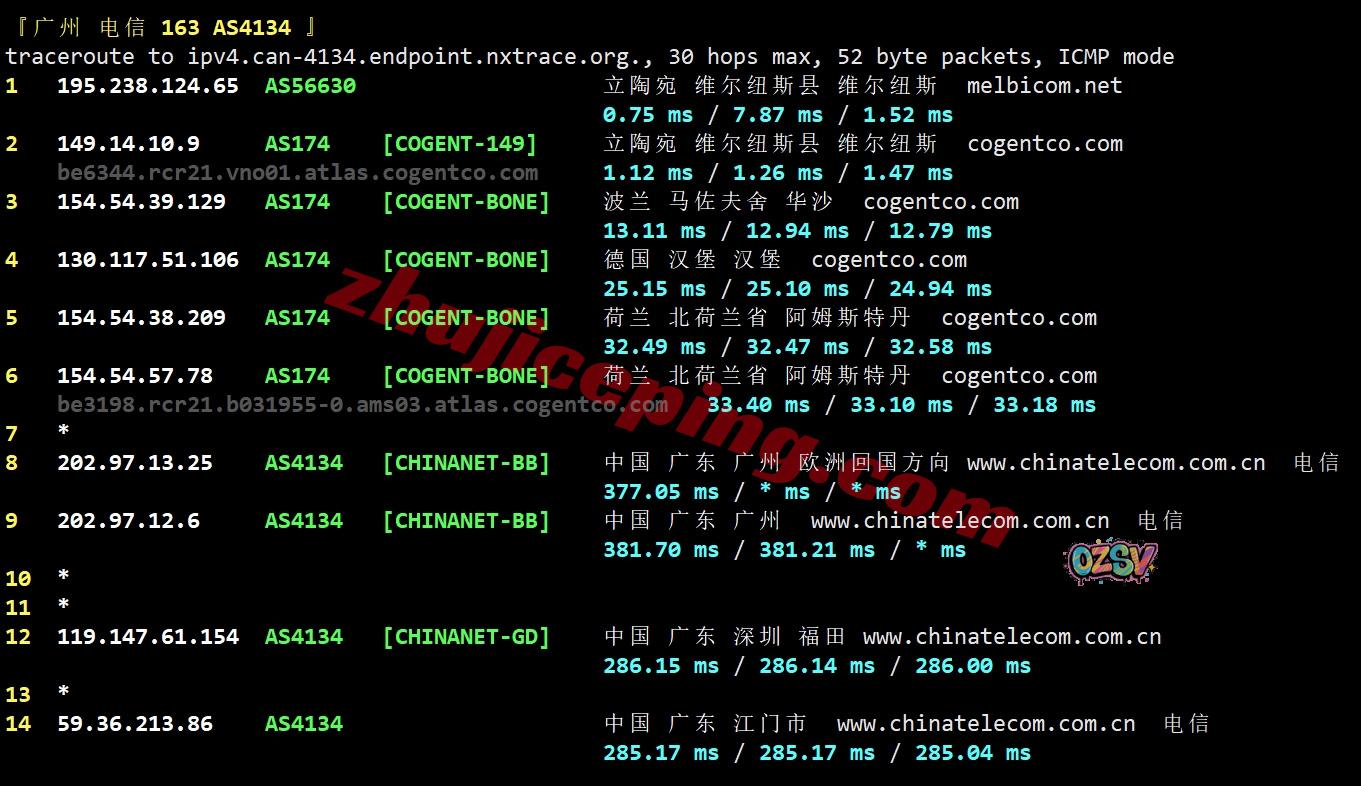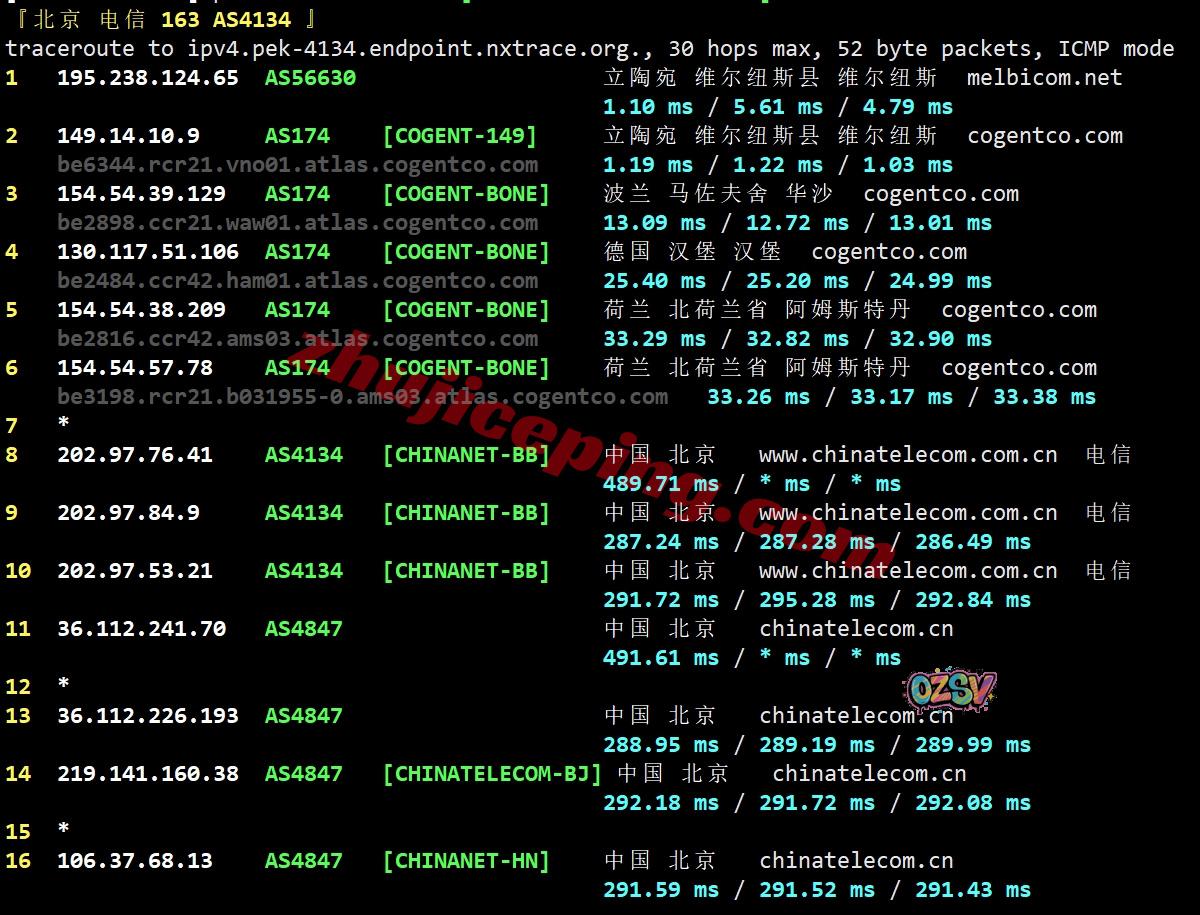 电信回程:走cogent经过波兰、德国、从荷兰出海回国