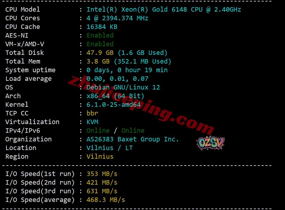 justhost多数机房的CPU都是e5-2697A v4,这次立陶宛机房用的是Gold 6148(20核心、40线程、主频2.4GHz、加速频率3.7GHz,是否是双路或者多路那就就不知道了),站长启用了BBR,支持IPv6,官方自己的AS,归属地立陶宛维尔纽斯,当前I/O大致468MB/S: