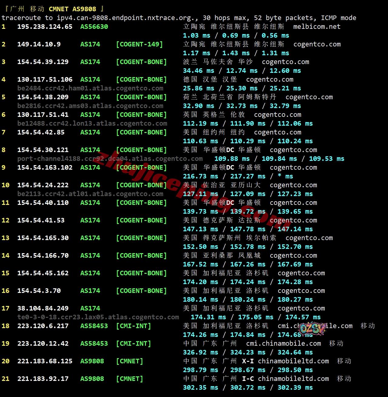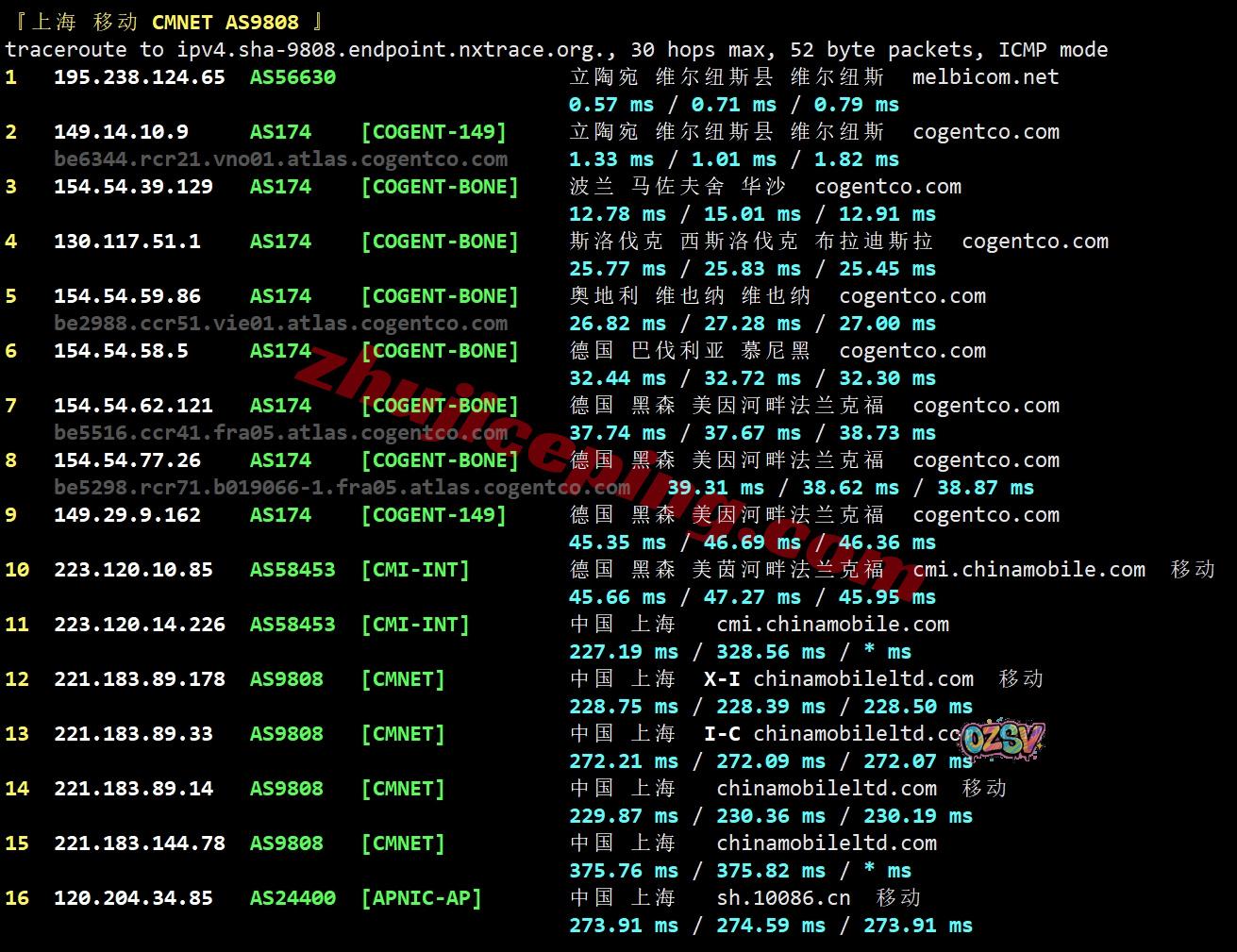 上海方向:走cogent经过波兰、斯洛伐克、奥地利、德国,从移动德国法兰克福节点直连回国