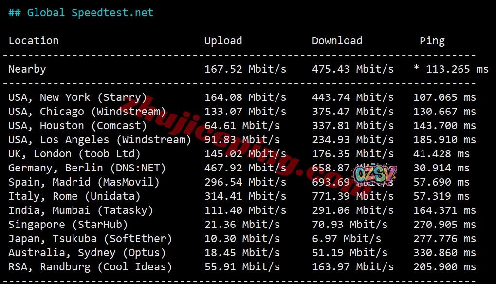 speedtest的部分国际节点的测试数据: