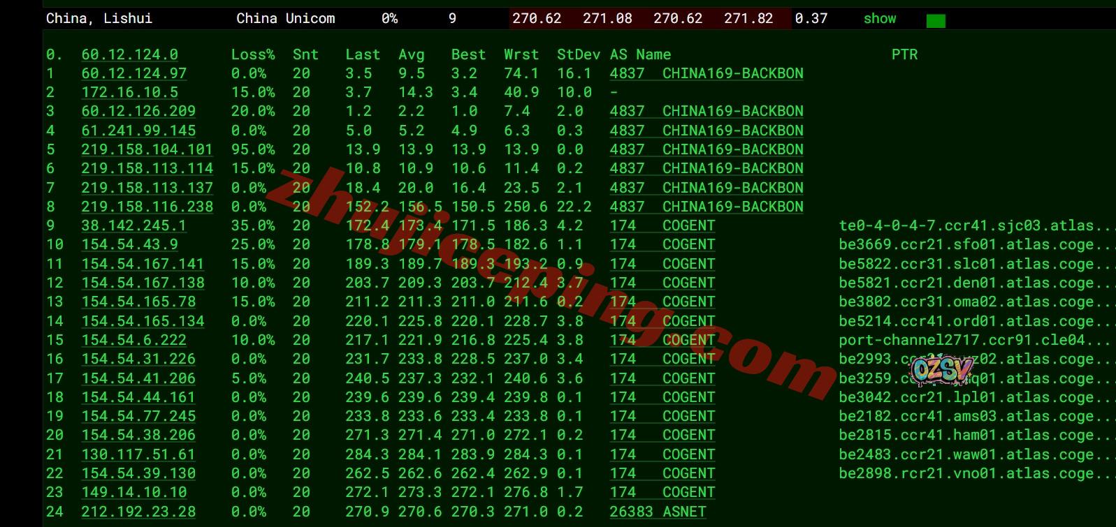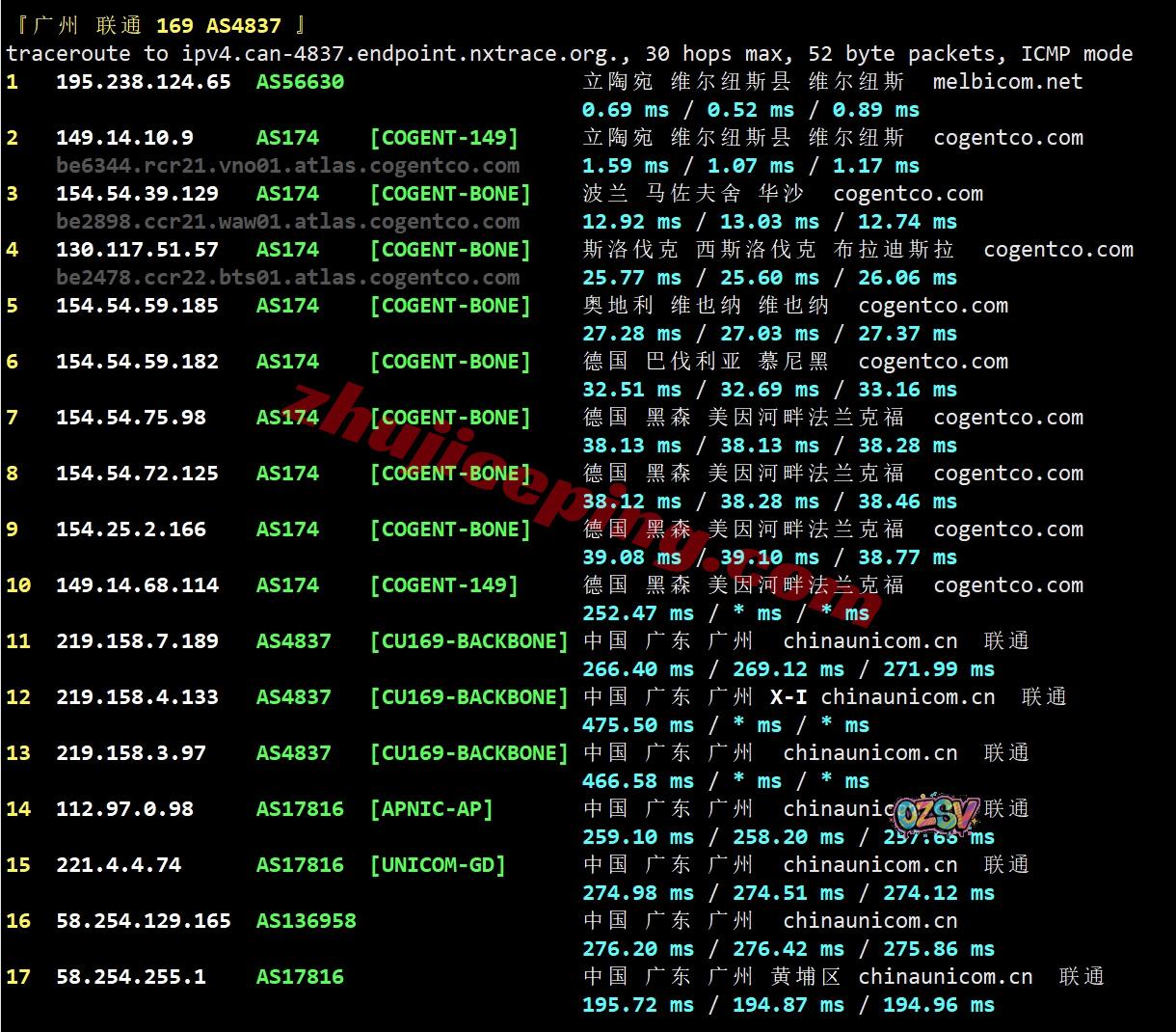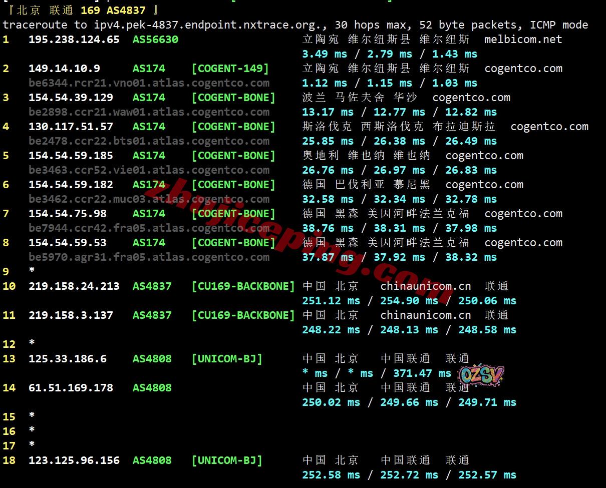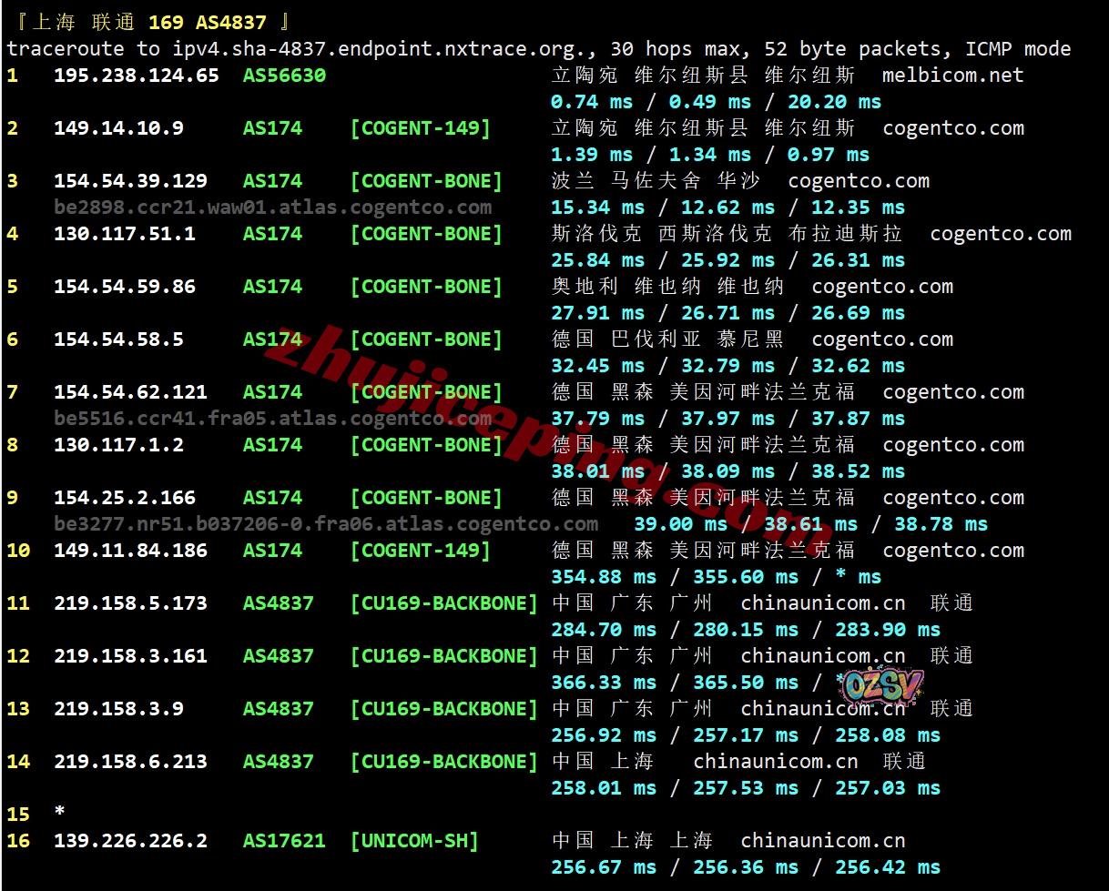 联通回程:走cogent经过波兰、斯洛伐克、奥地利、从德国出海回国