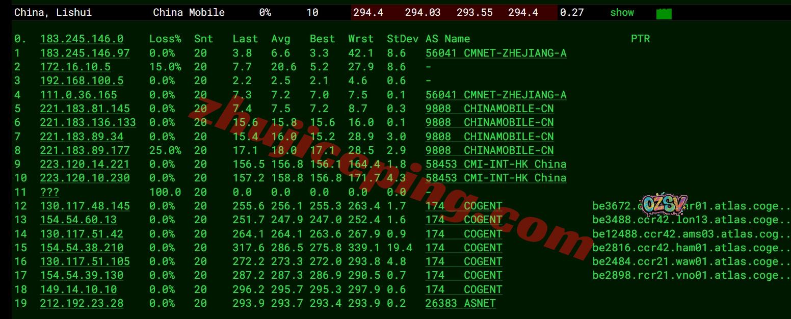 移动去程:直连移动英国伦敦节点然后接cogent去英国、荷兰、德国、波兰、立陶宛