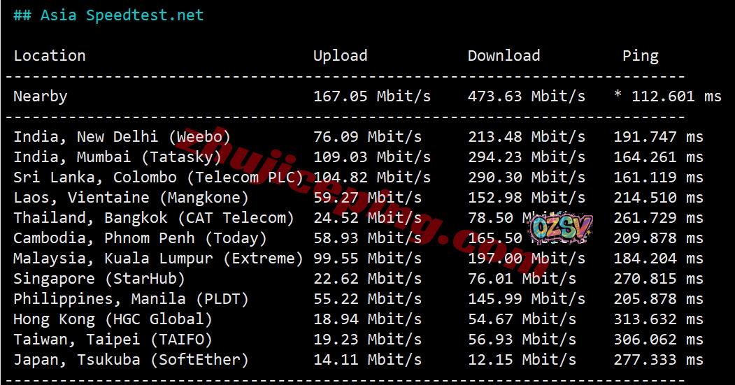 speedtest.Net的部分亚洲节点的带宽上下行测试: