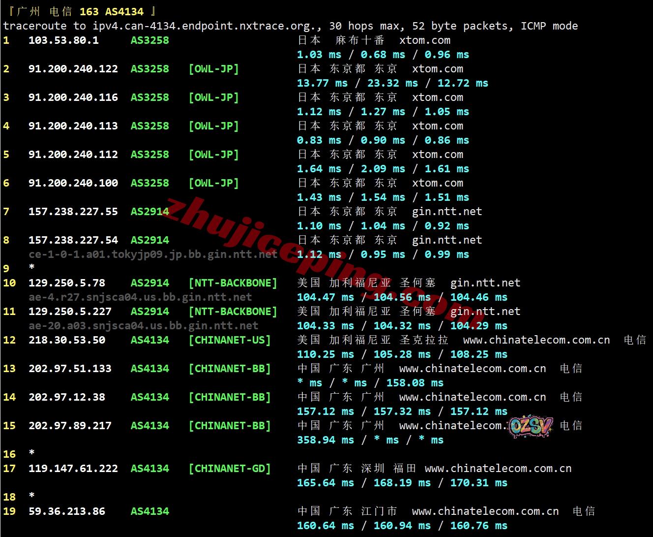 广州方向:走NTT先去美国圣何塞,然后从圣何塞电信节点直连回中国