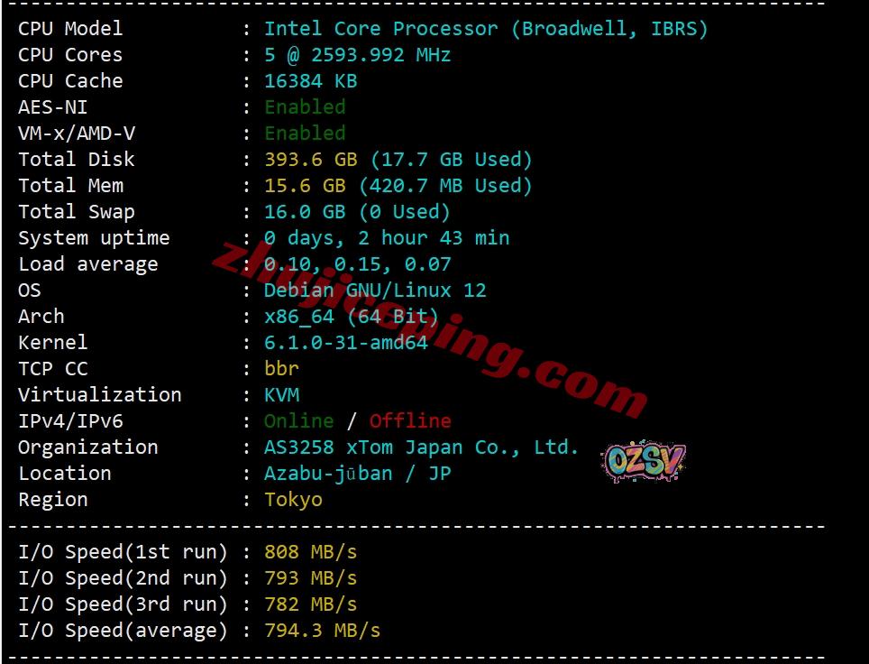 服务器用的啥CPU不知道,主频2.6GHz,站长启用了BBR,不支持IPv6,上游为XTom,当前I/O大致794MB/S: