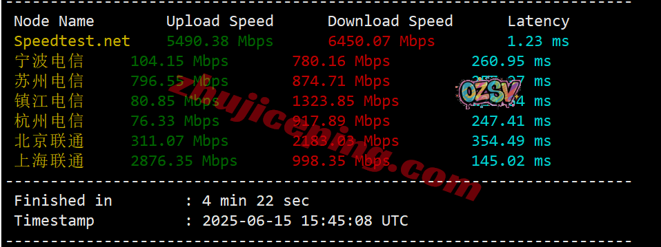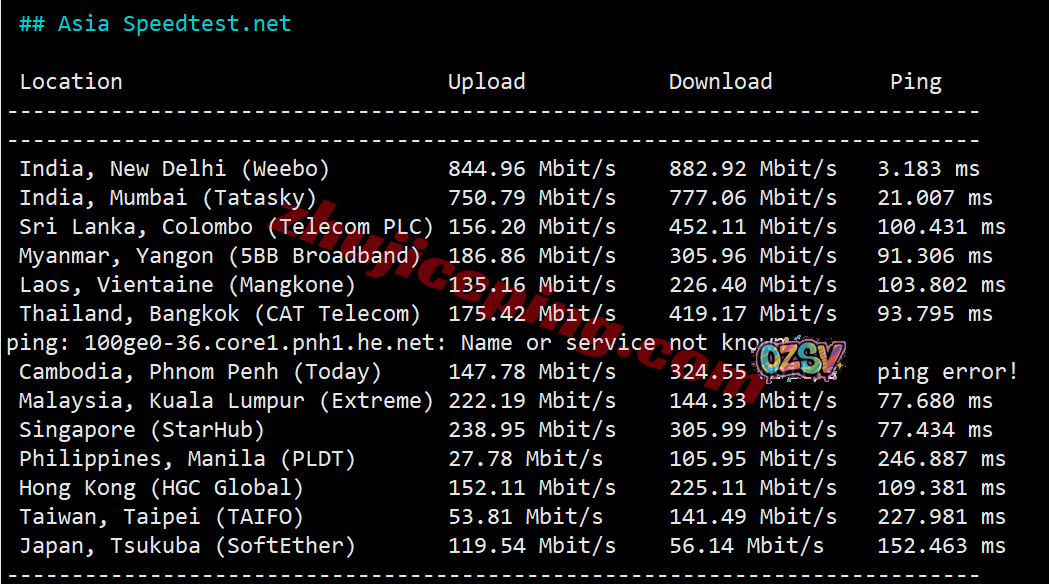 SpeedTest.Net的部分亚洲境内的节点的带宽上下行测试数据: