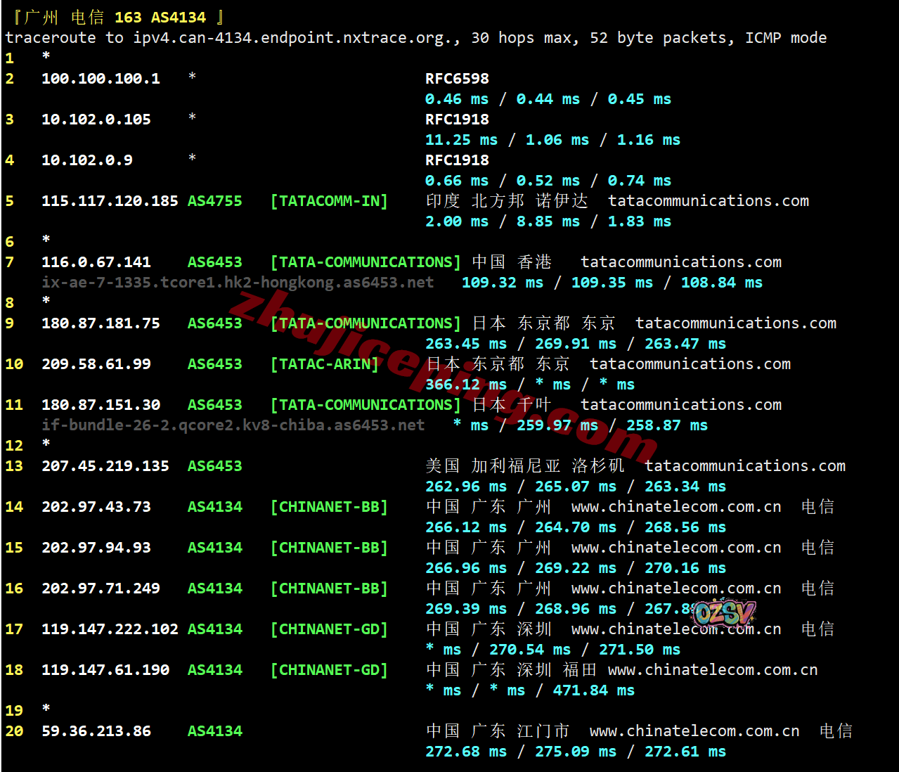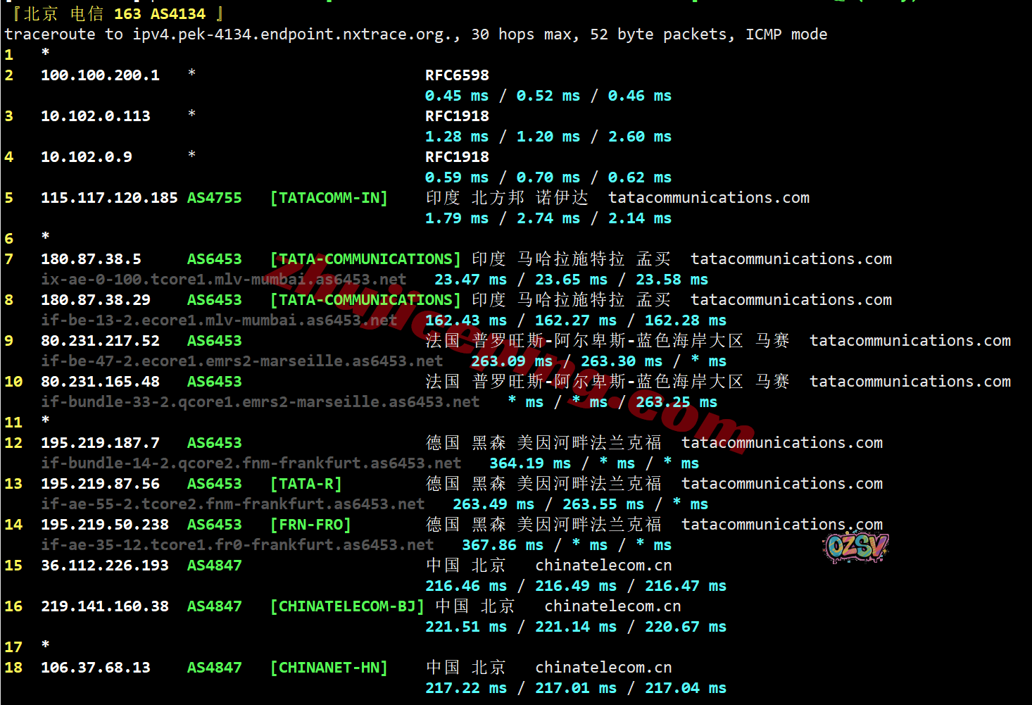 电信去程:直连香港然后接TATA去新加坡再去印度
