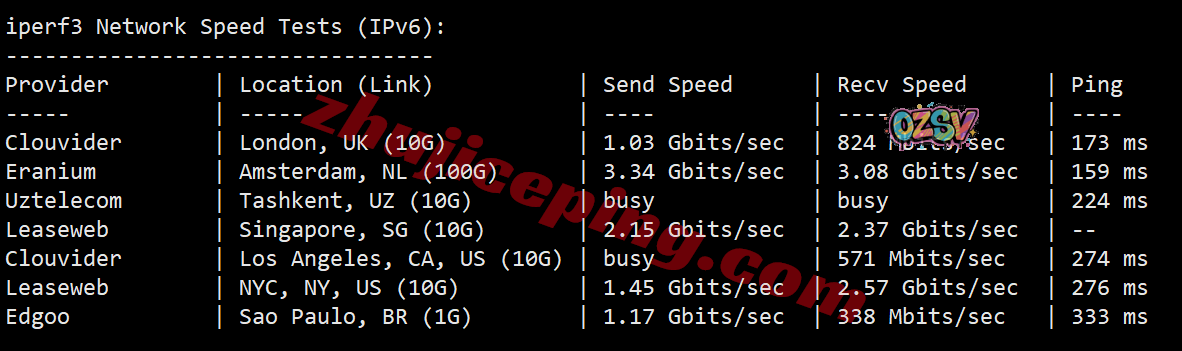 IPv6环境下,IPERF3测试,几个热门国际节点的测试数据: