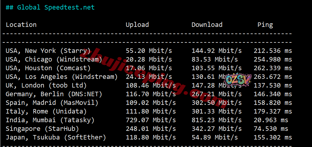 SpeedTest.Net的部分国际节点的带宽上下行测试数据: