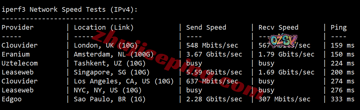 IPv4环境下,IPERF3测试,几个热门国际节点的测试数据: