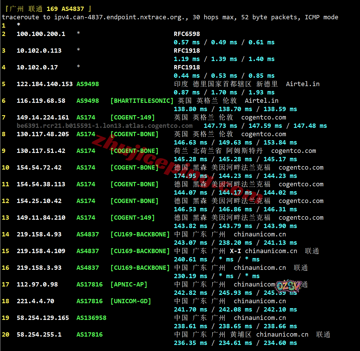 广州方向:走airtel先去英国然后转cogent去荷兰、然后从德国出海回国