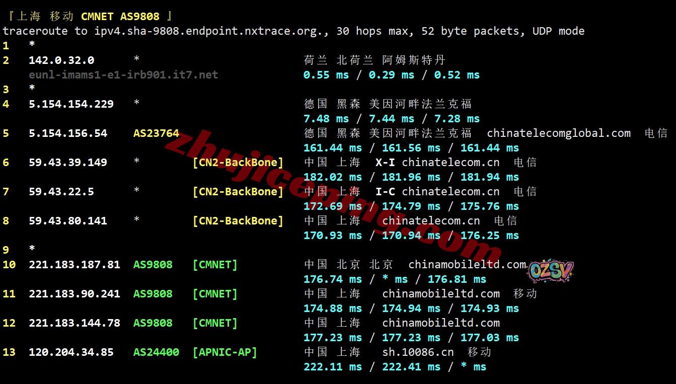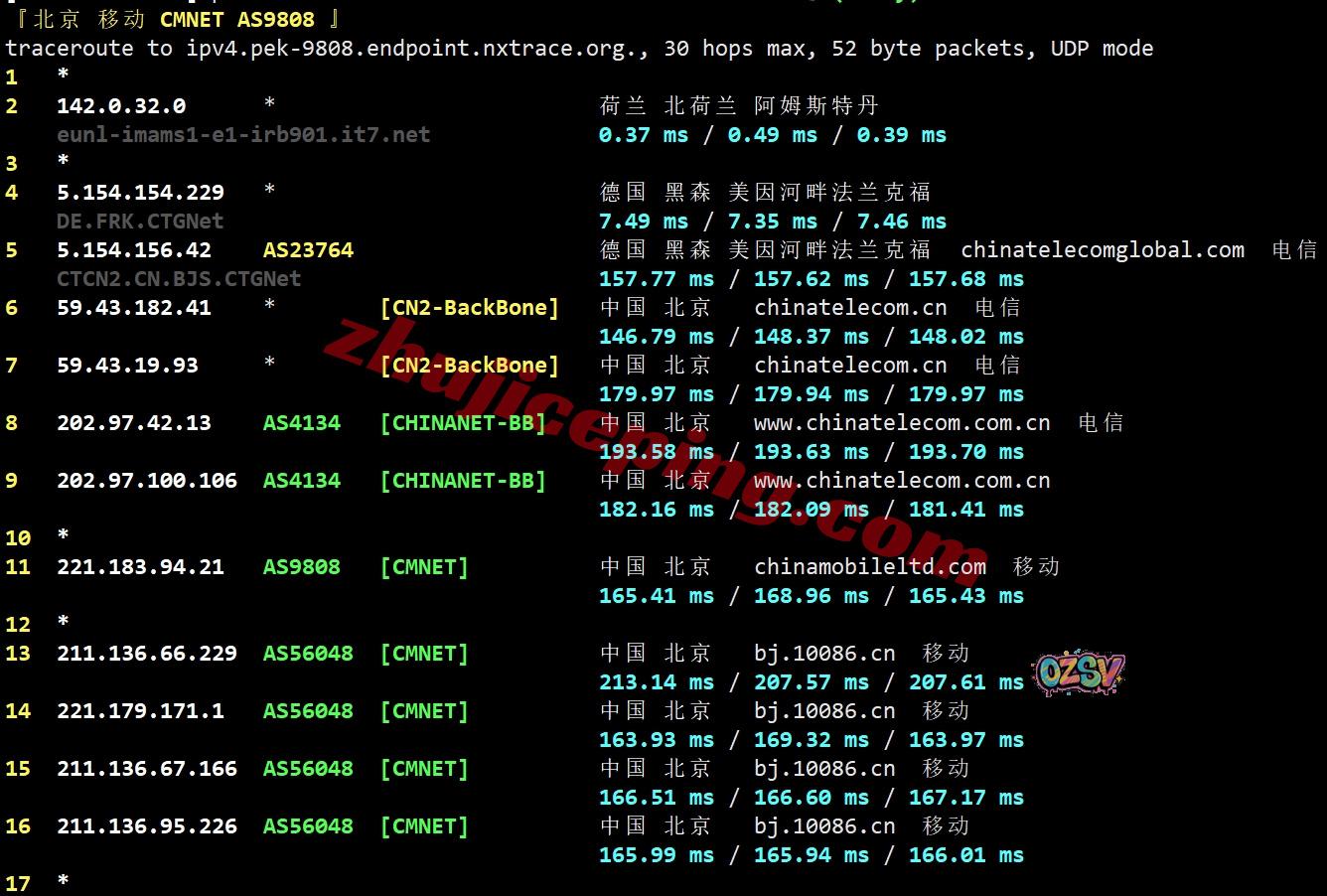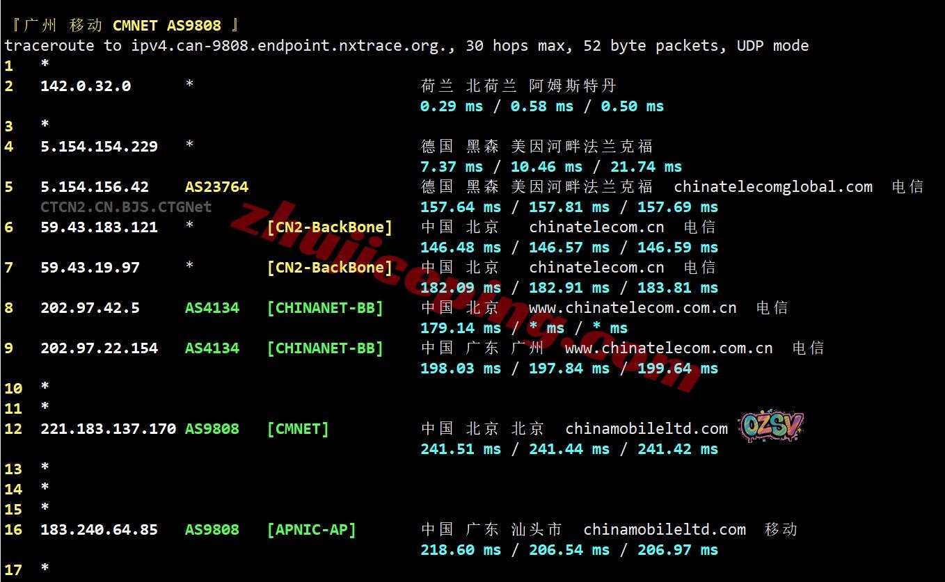 移动回程:还是一样先CTG到德国,然后CN2回国,一样借道的电信高端链路回国