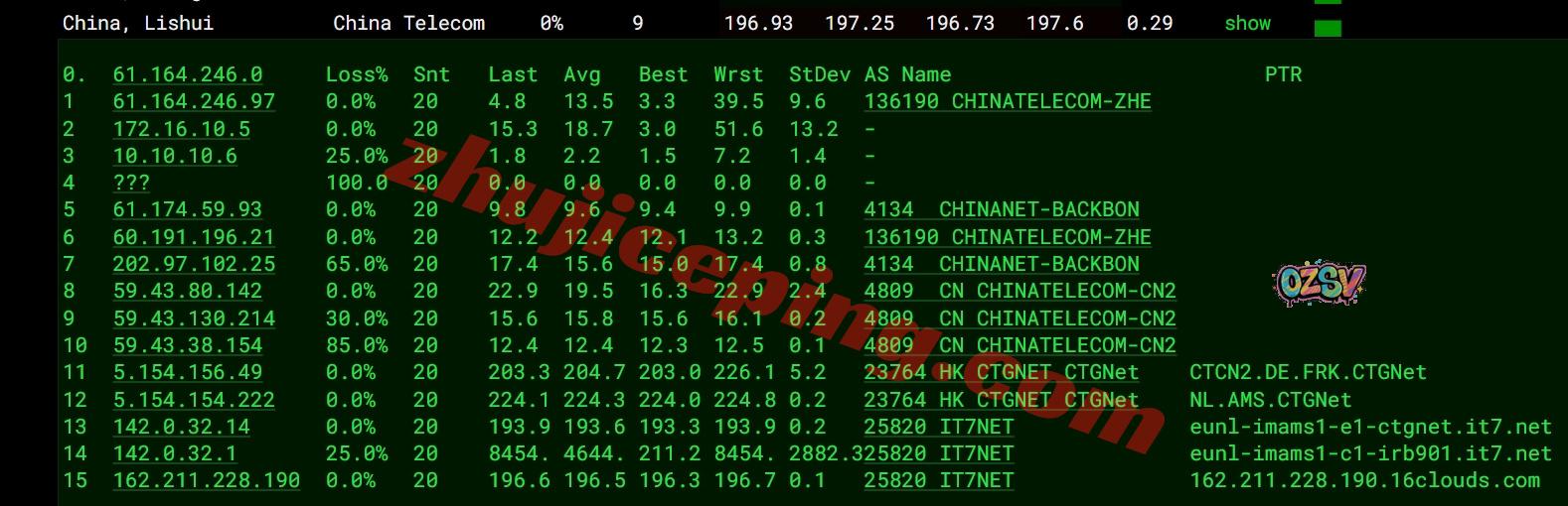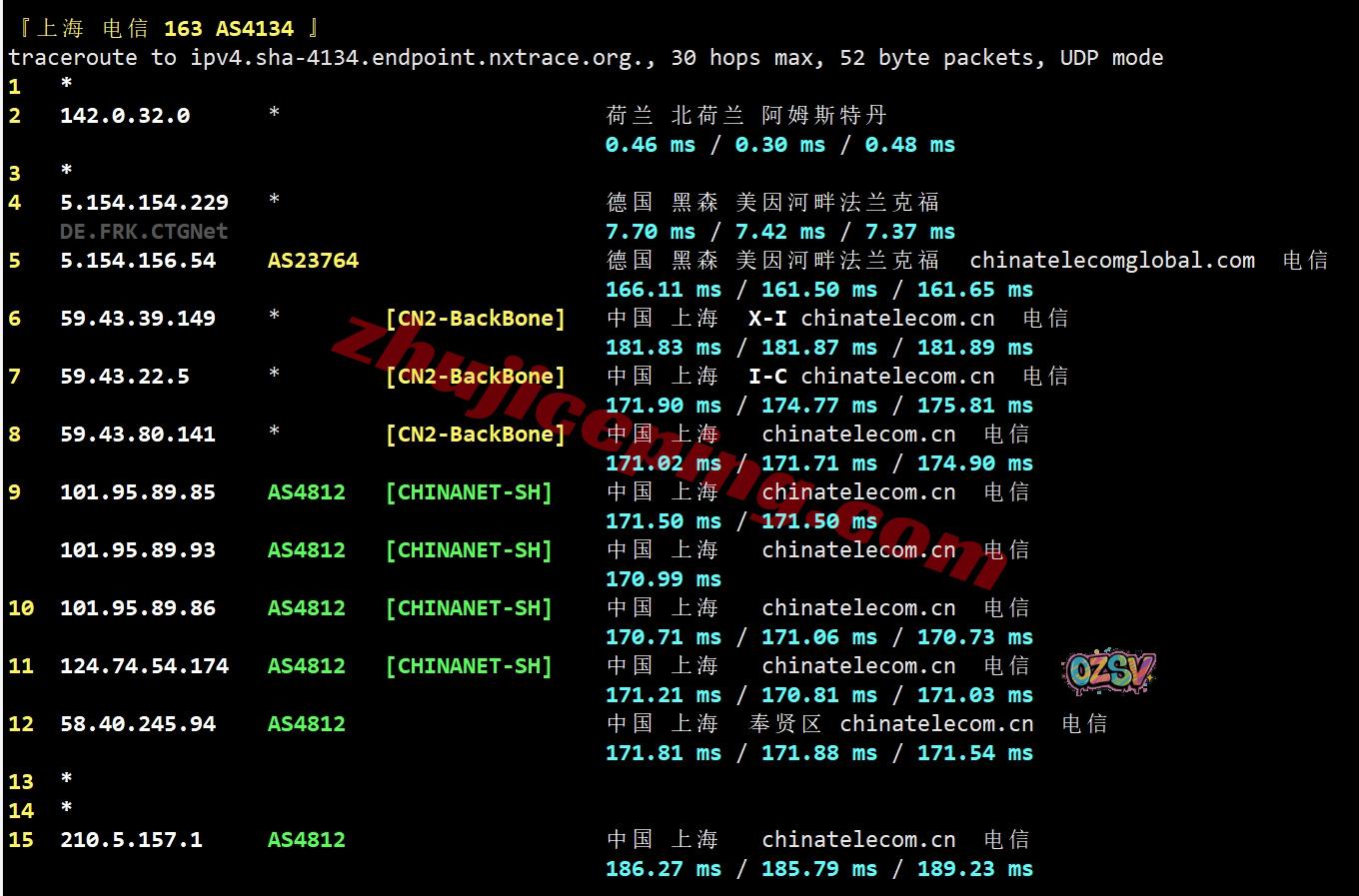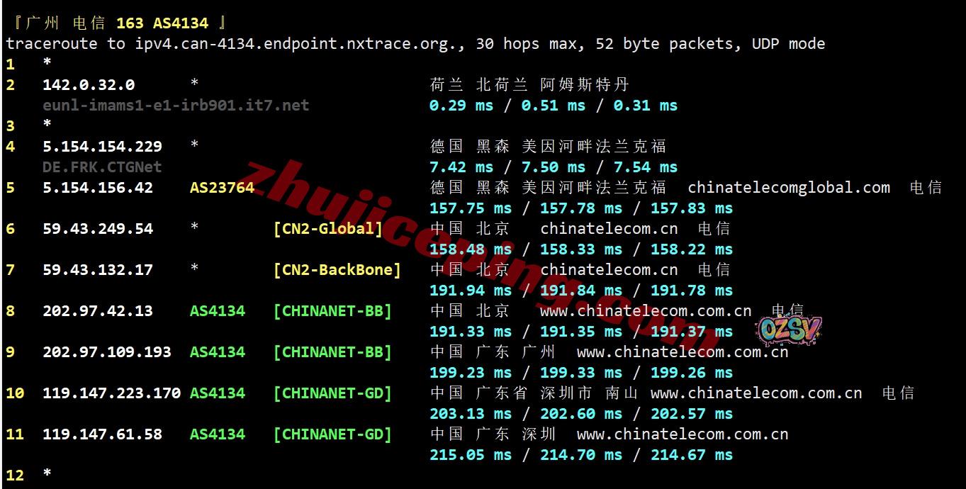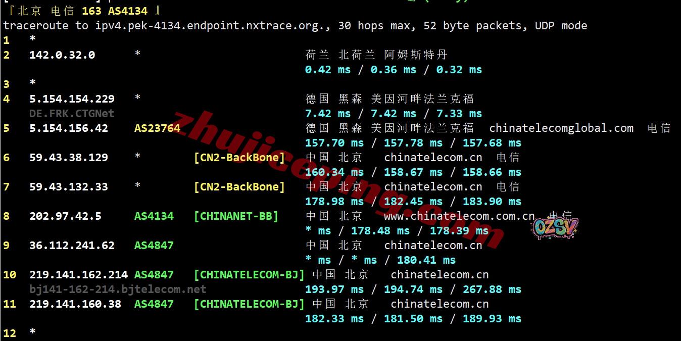 电信回程:电信CTG先到德国,然后转CN2回国