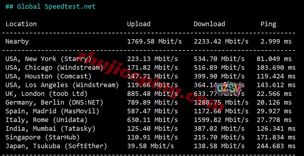 看看speedtest.Net的部分国际节点的带宽上下行测试数据: