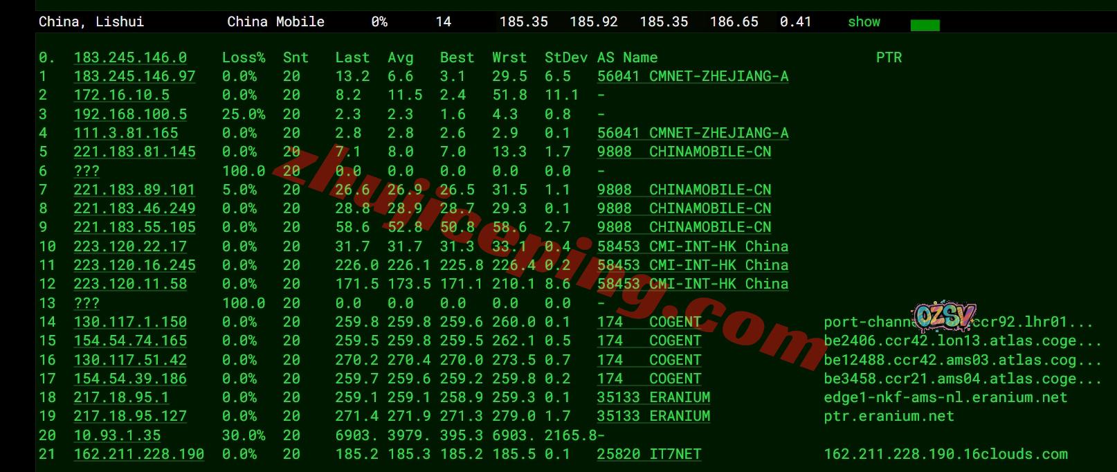 移动去程:直连移动英国伦敦CMI节点然后转cogent去荷兰