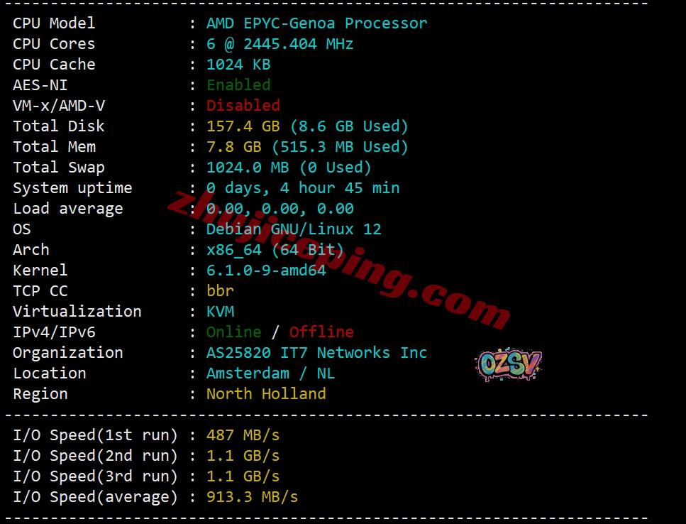 服务器的CPU从测试图来看显示的是AMD EPYC 9004,主频2445.404MHz,实际上这只是虚拟化后的DIY显示,比如AMD EPYC 7763也是这个主频,毕竟9004的价格太离谱了… 站长启用了BBR,站长为了快速测试没有在后台启用BBR,网络为搬瓦工自己,归属地为荷兰阿姆斯特丹,当前测试I/O大致在913MB/S: