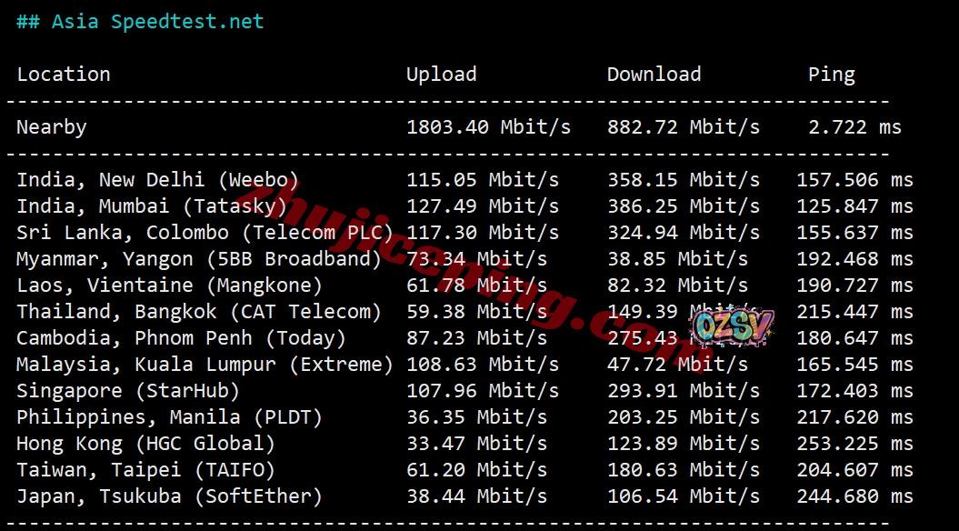 speedtest的部分亚洲区域内的节点的带宽上下行测试数据:
