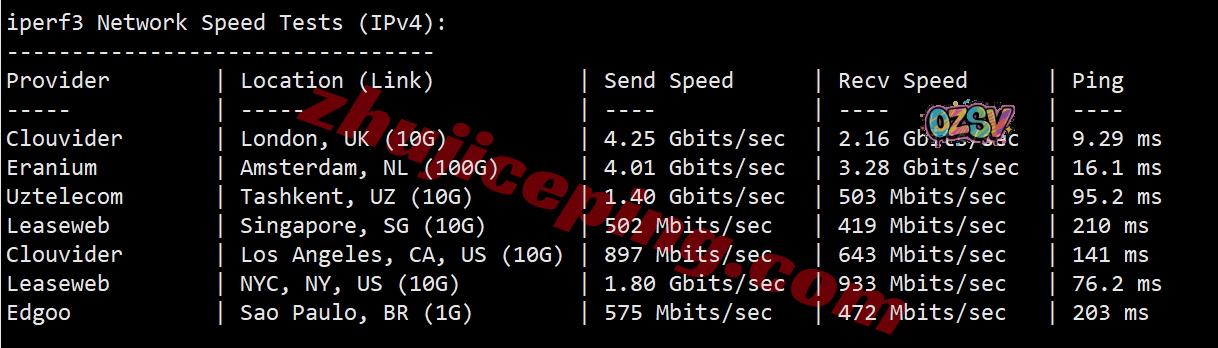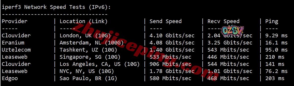 iperf3,在IPv6环境下的几个国际节点的测试数据: