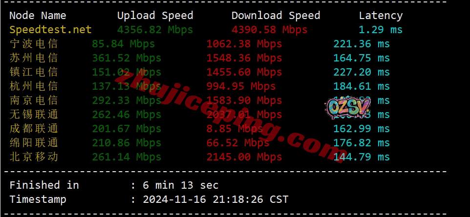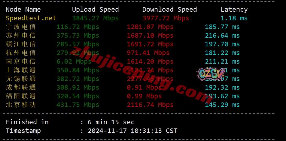 国内三网多节点的带宽上下行实测测试数据:
