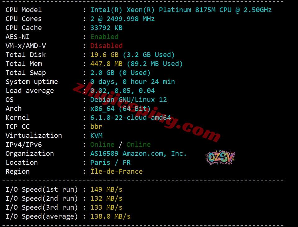 Intel Xeon Platinum 8175M(24核、48线程、主频2.5GHz、加速频率3.5GHz),站长启用了BBR,支持IPv6,亚马逊自己的网络归属地,归属地法国巴黎,当前I/O大致138M/S: