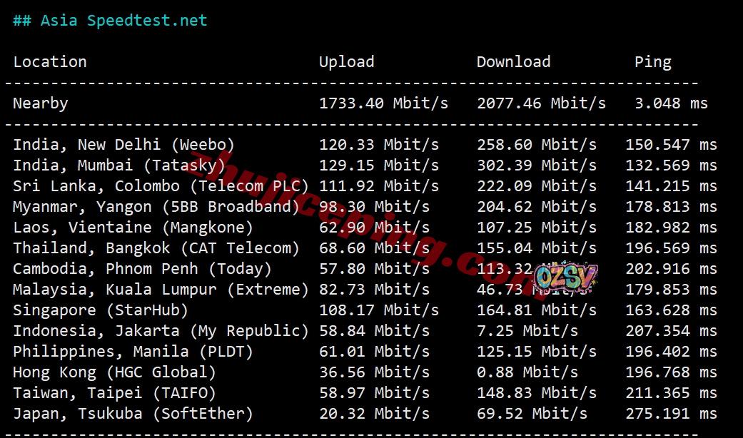 speedtest的部分亚洲节点的带宽上下行测试数据: