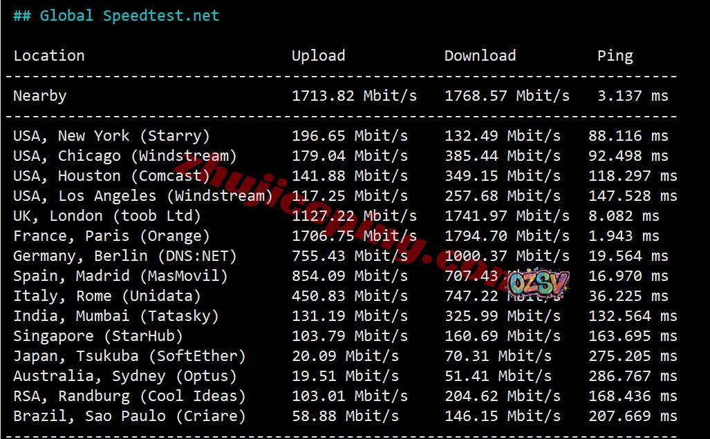 speedtest.Net的部分国际节点的带宽上下行测试数据: