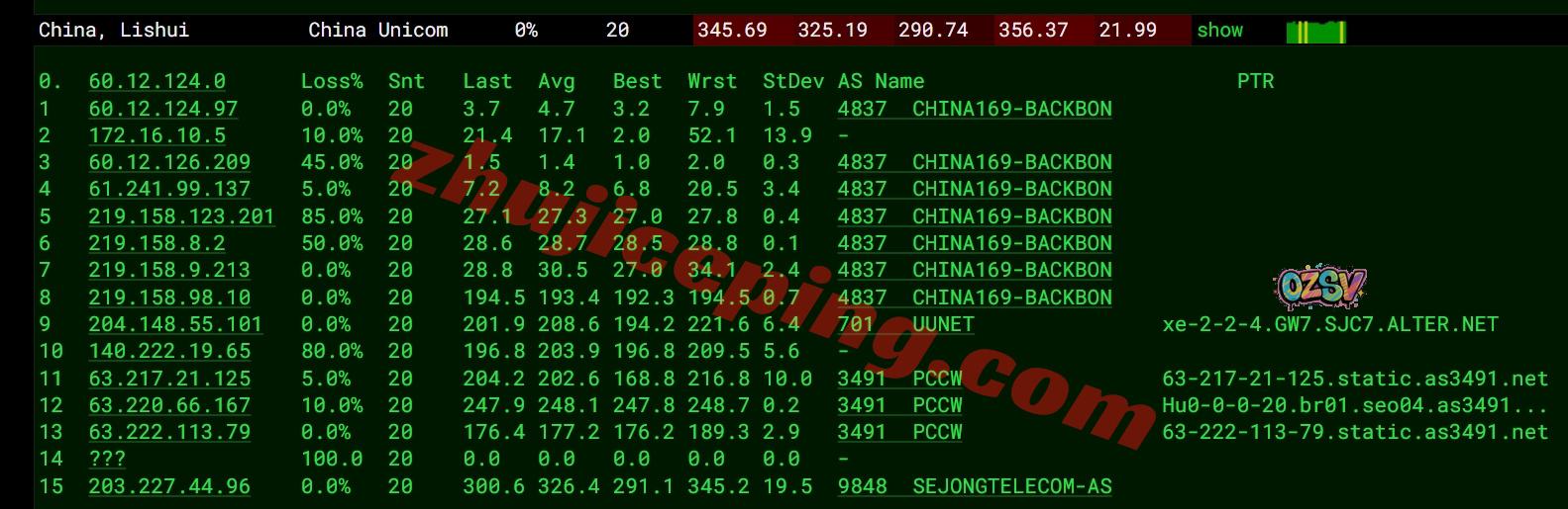 联通去程:直连联通美国圣何塞节点,然后接alter.net转PCCW回韩国