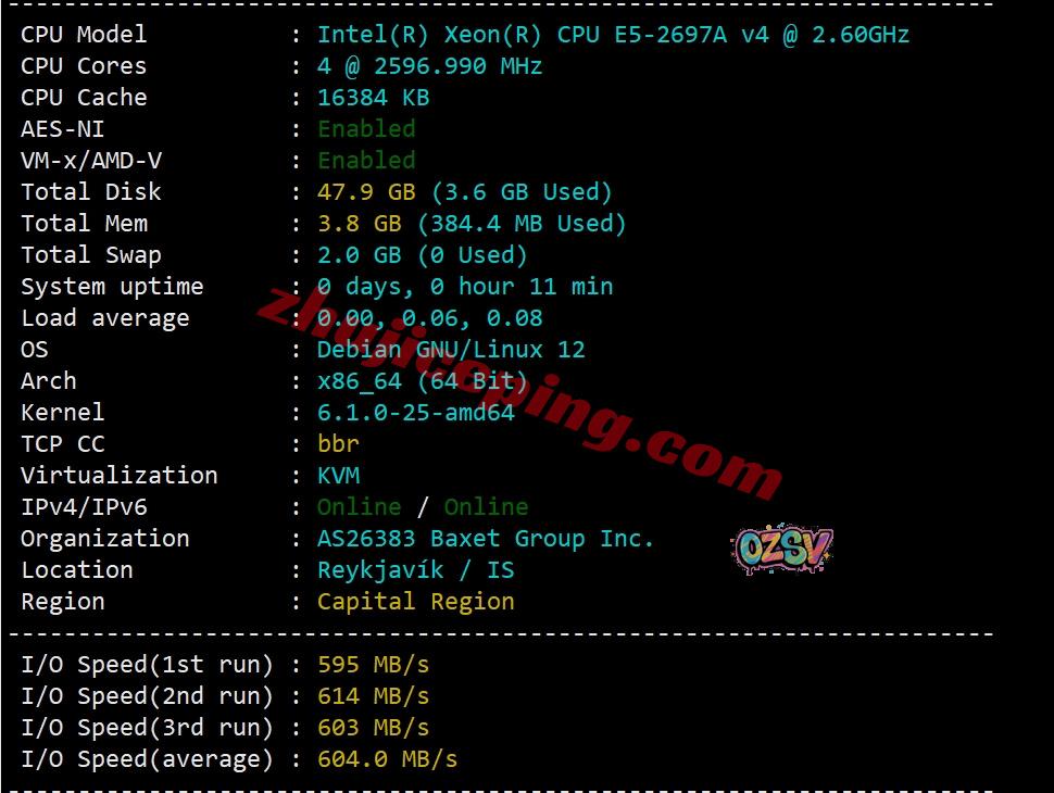 VPS所在服务器用的CPU型号为e5-2697A v4(一般是双路,32核、64线程、主频2.6GHz、加速频率3.6GHz),站长开启了BBR,该VPS支持IPv6,justhost自己的AS,归属地是冰岛,当前测试得知I/O大致604MB/S: