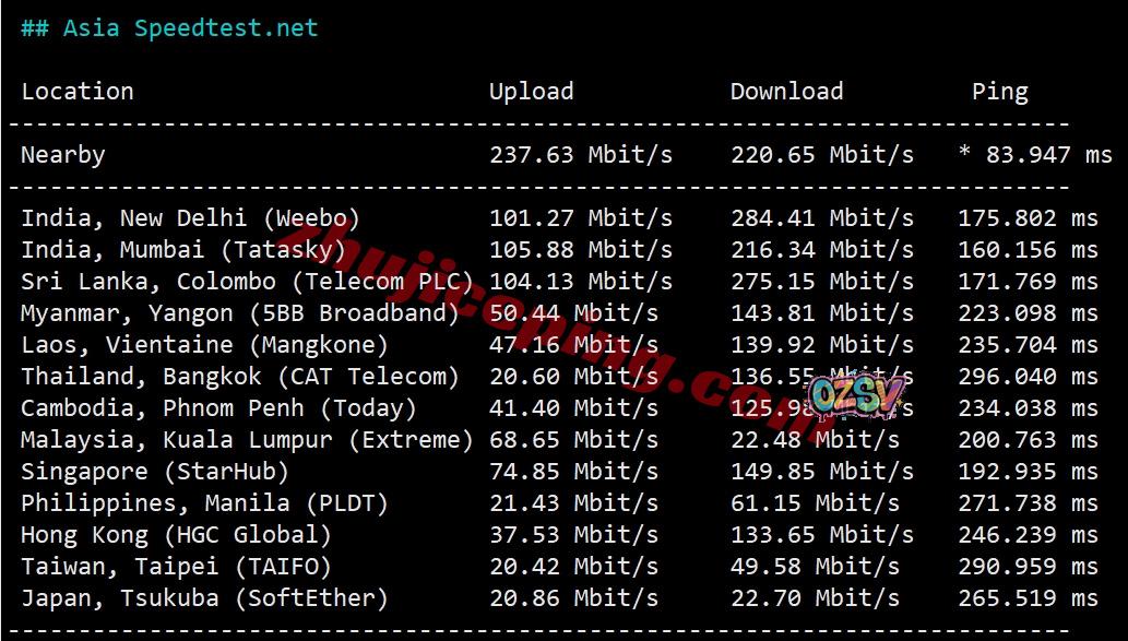 speedtest.Net部分亚洲节点的带宽上下行测试数据: