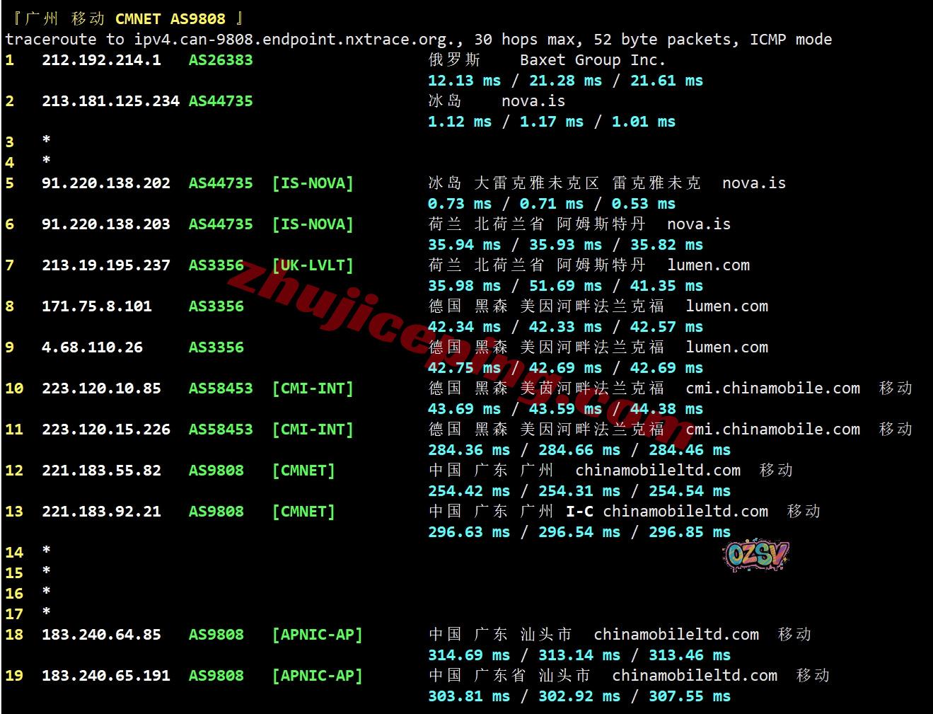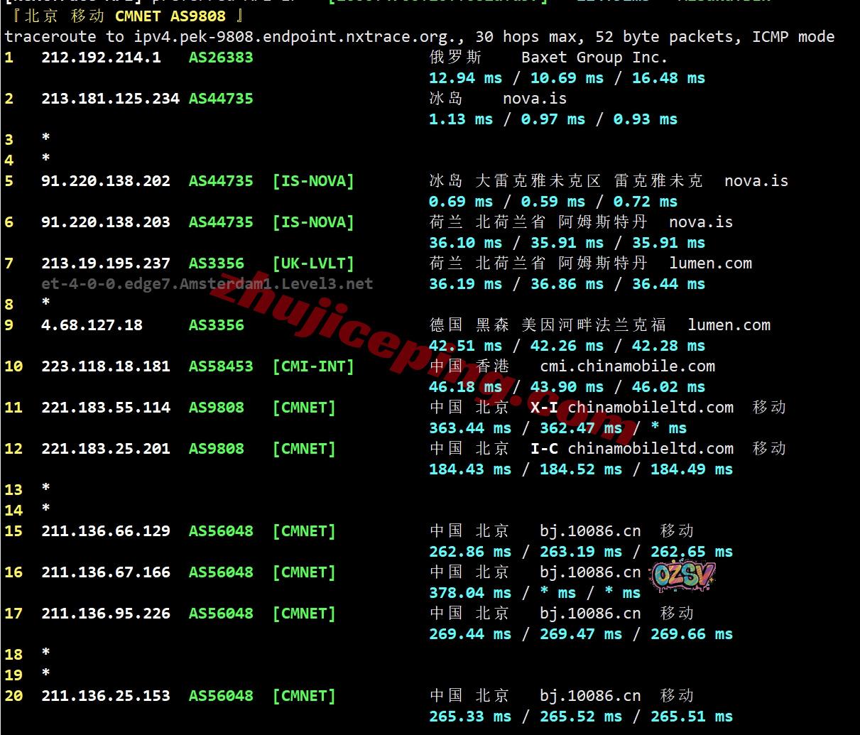 北京/广州方向:走nova到荷兰接lumen去德国,从移动德国法兰克福CMI节点直连回国