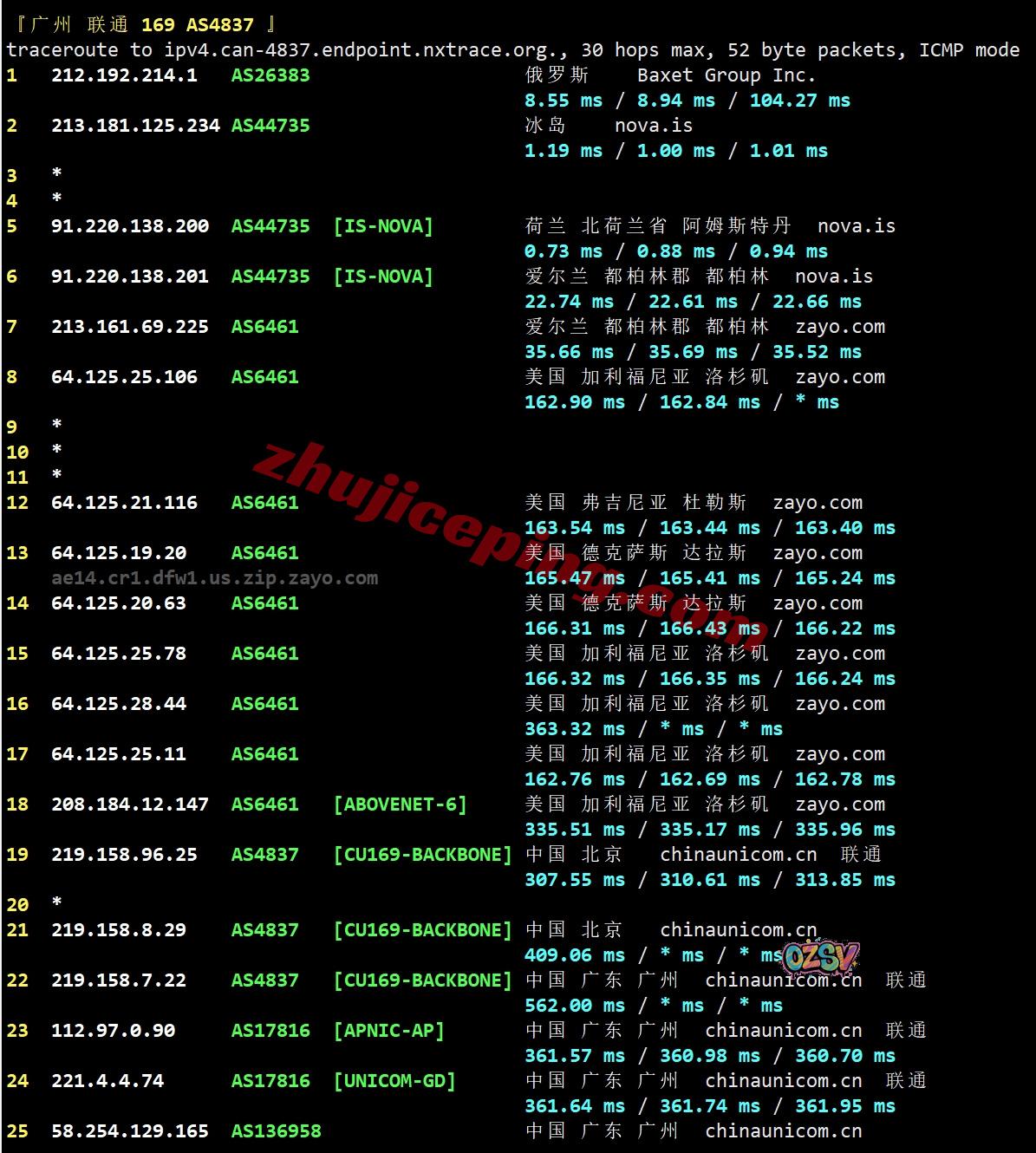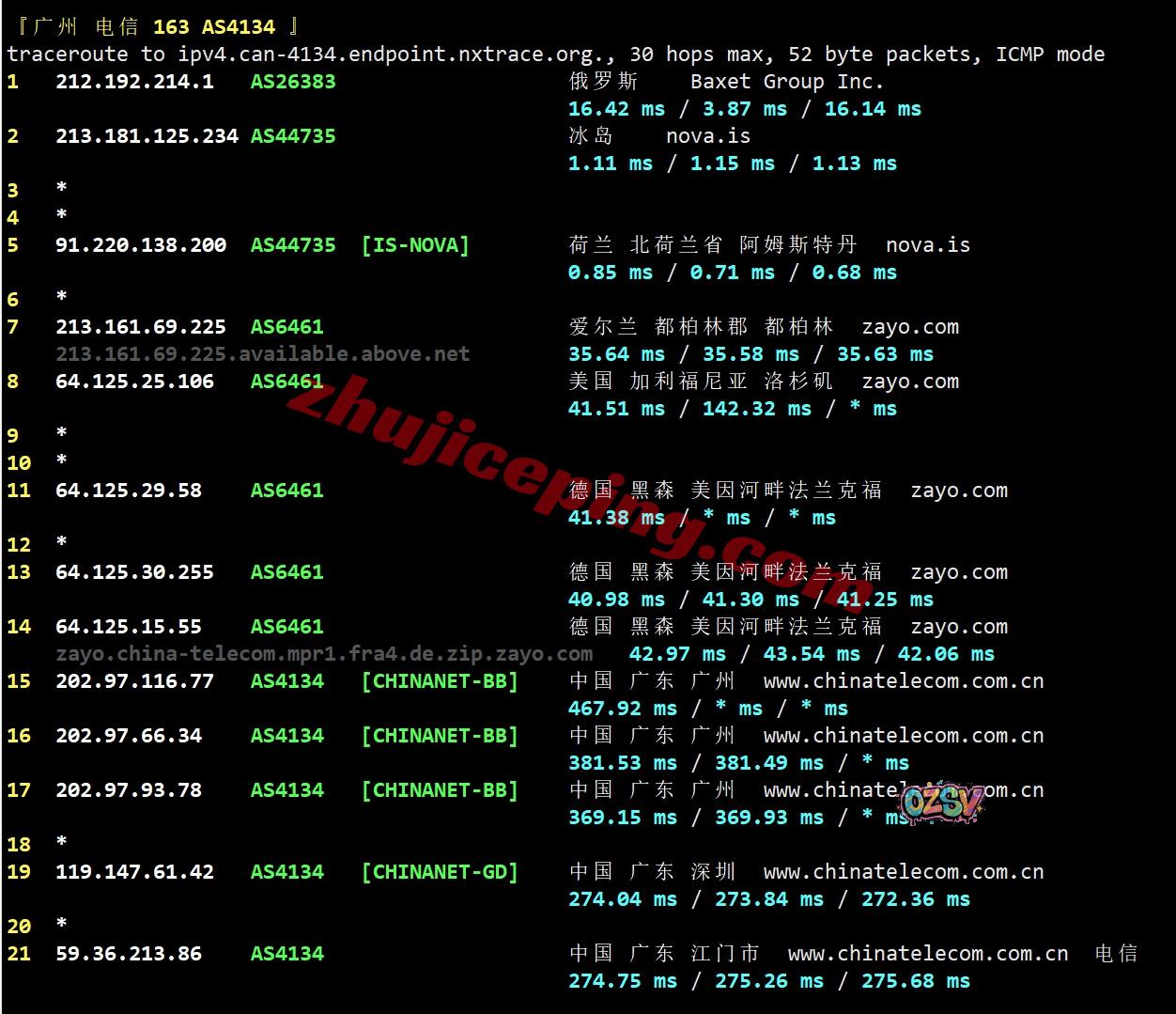 广州方向:走nova到爱尔兰接zayo去德国,从电信法兰克福peer/zayo出海回国