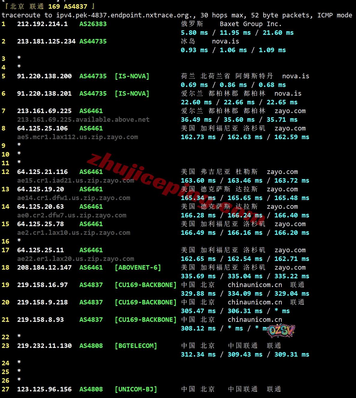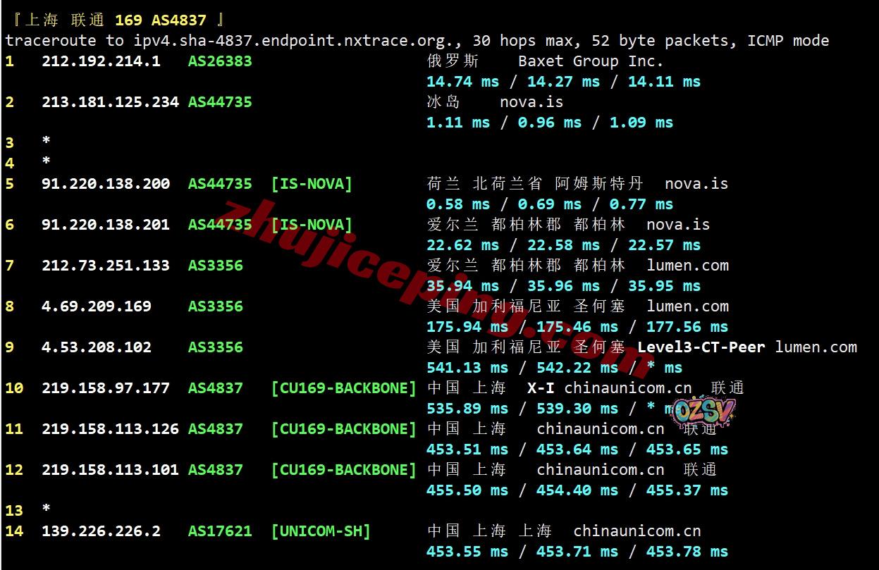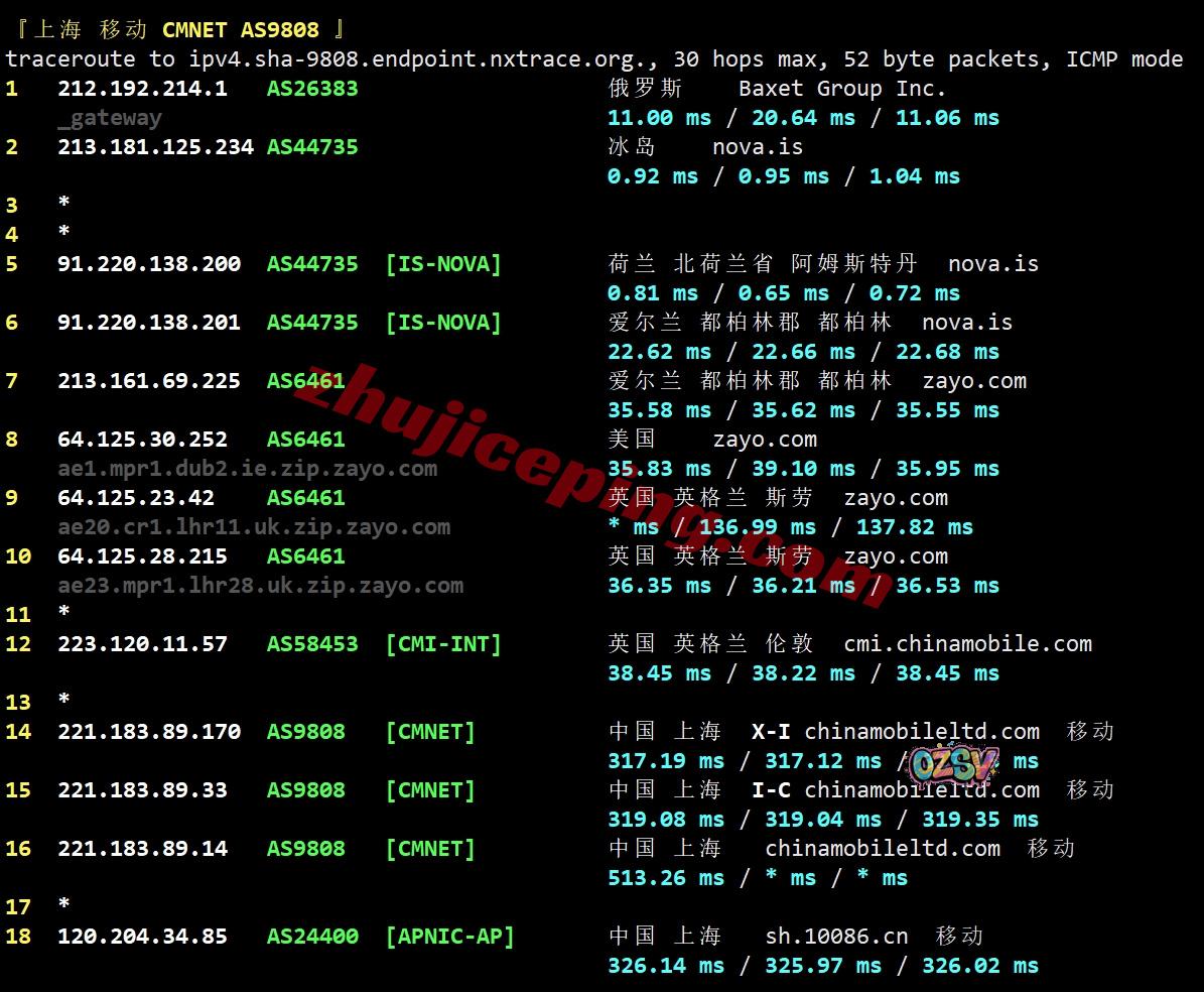 上海方向:走nova经过爱尔兰接zayo去英国,从移动英国伦敦CMI节点直连回国