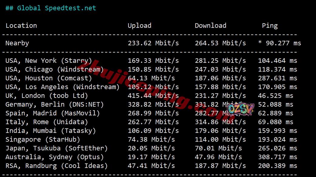 speedtest.Net的部分全球节点的带宽上下行测试数据分享: