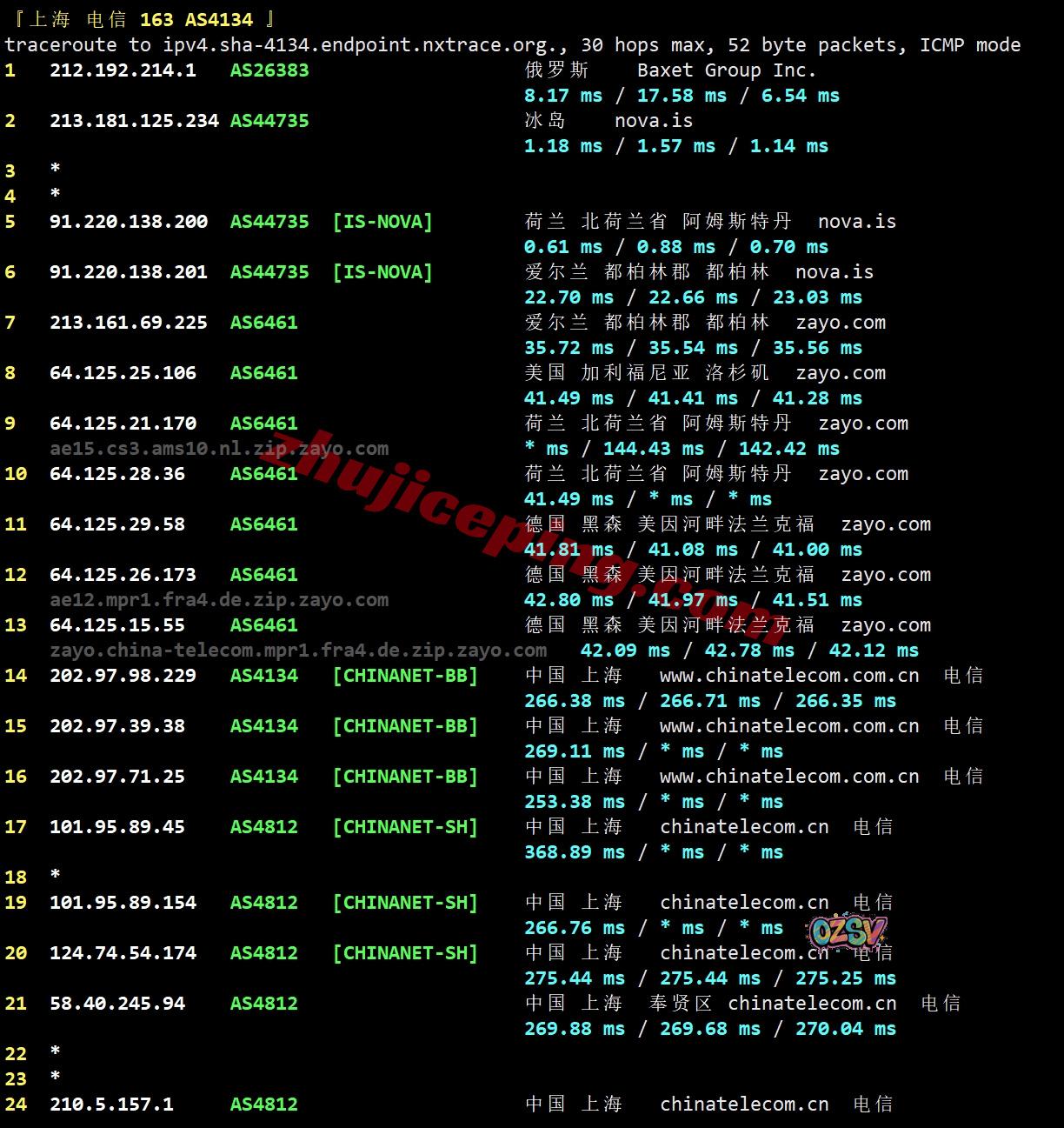 上海方向:走nova经过爱尔兰接zayo去荷兰、德国,从电信法兰克福peer/zayo出海回国