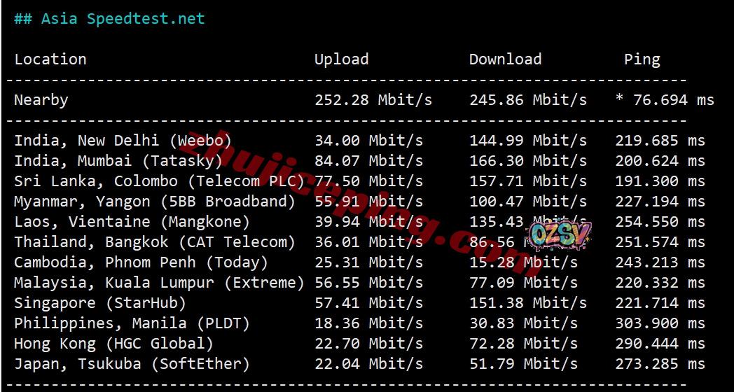 speedtest.Net的部分亚洲节点的测试数据: