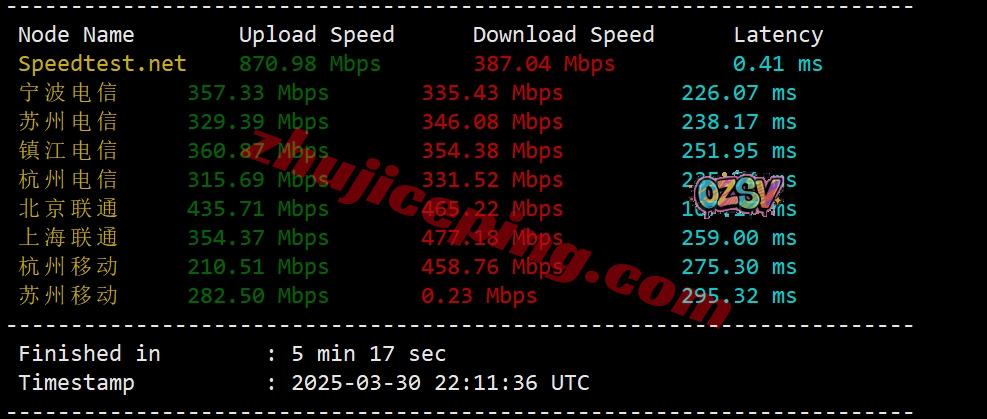 国内三网多节点的带宽上下行测试数据分享: