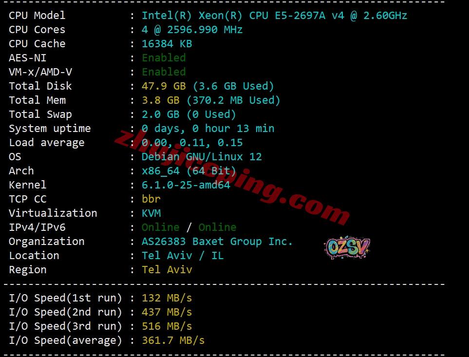 母鸡的CPU为e5-2697A v4(一般是双路,32核、64线程、主频2.6GHz、加速频率3.6GHz),站长启用了BBR,支持IPv6,justhost自己的AS,归属地特拉维夫,当前I/O测试大致为361MB/S: